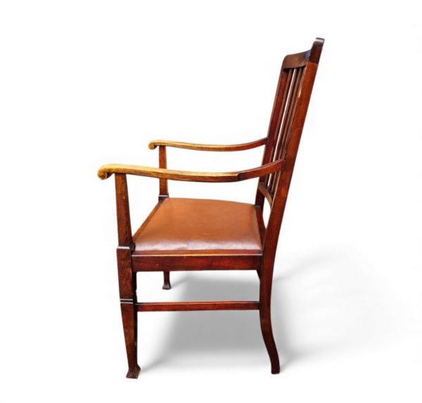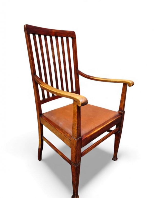 Crafted from solid oak, it features an elegant slatted backrest, curved arms, and a padded leather seat in a warm brown tone.