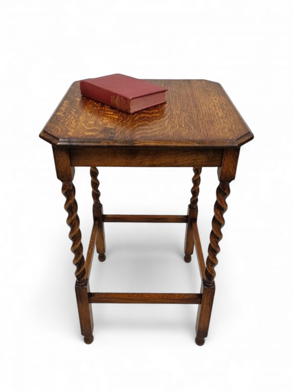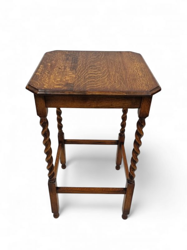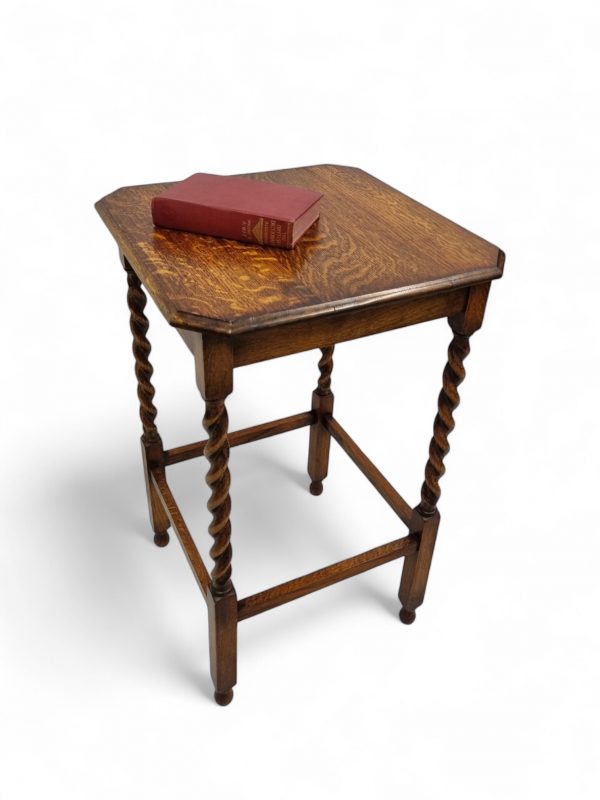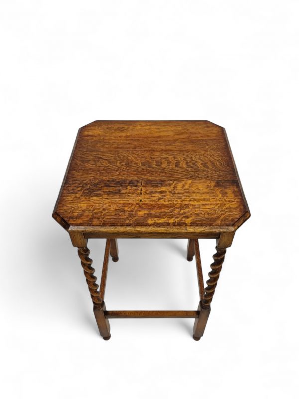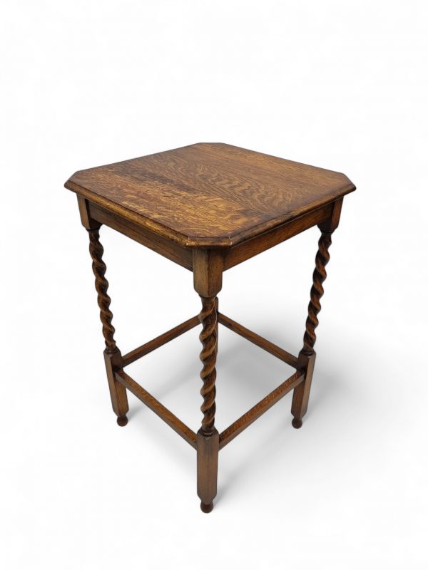 An antique oak side table with moulded octagon top, raised on square and barley twist turned legs in lights oak colour.