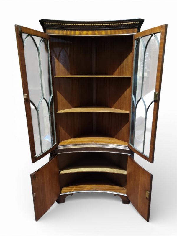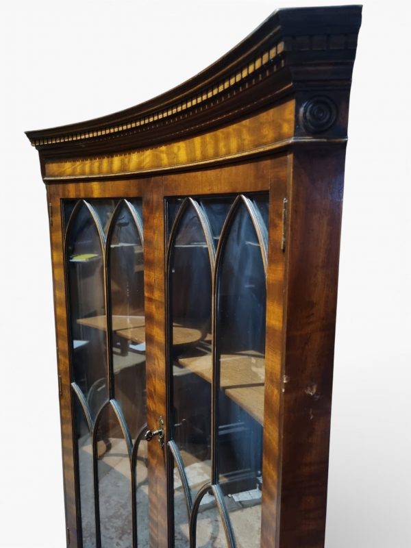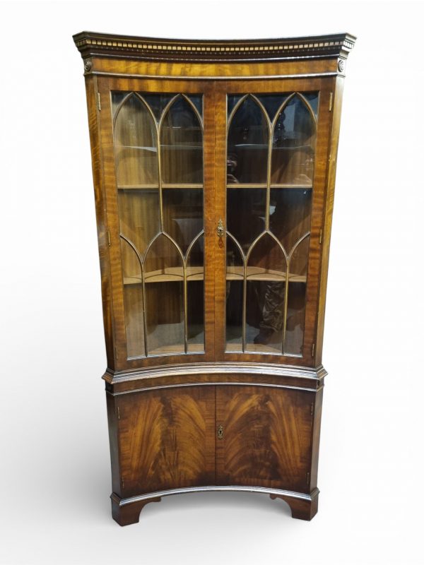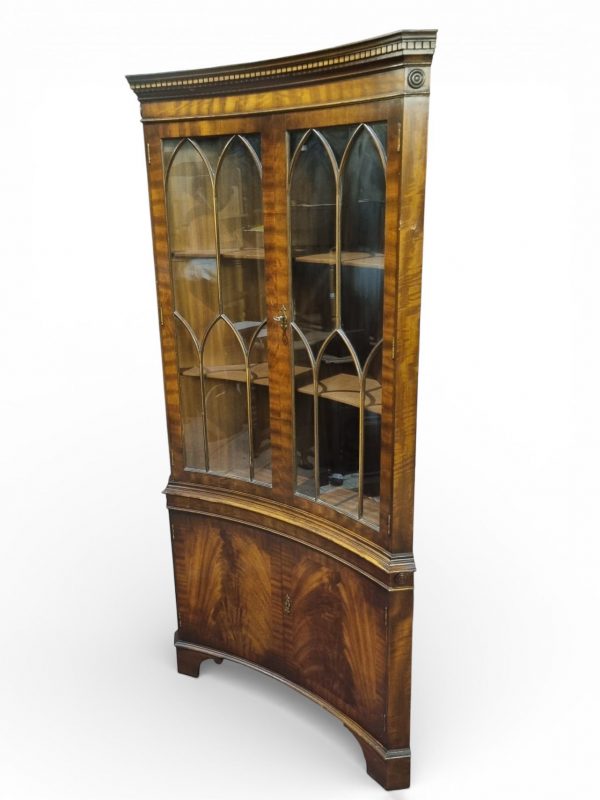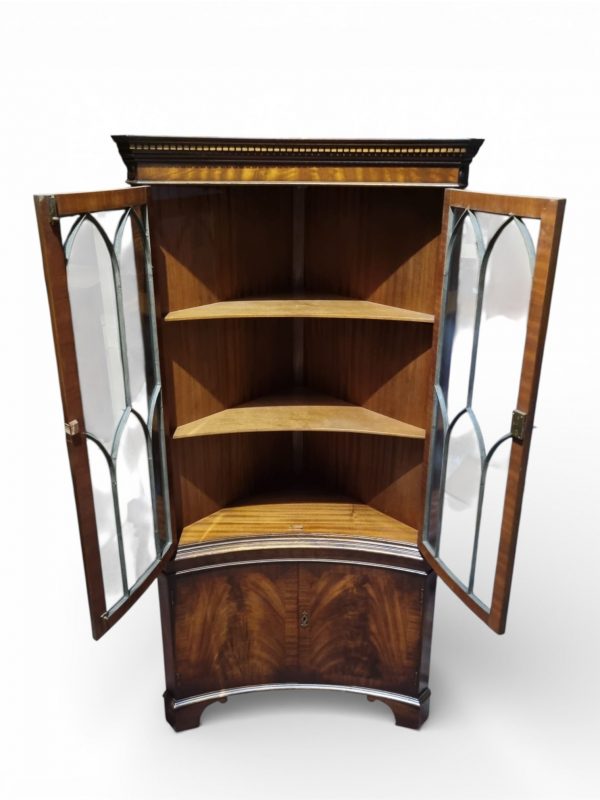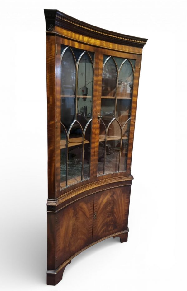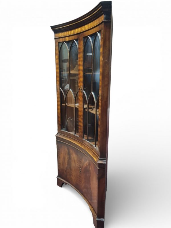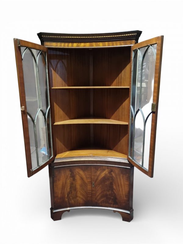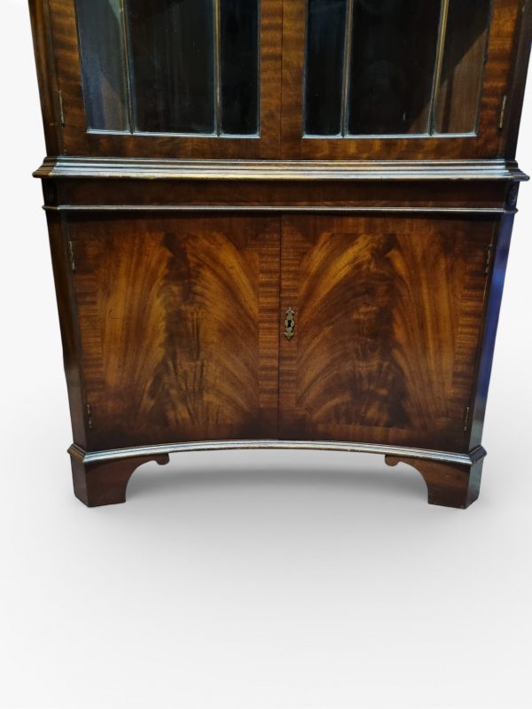 A beautiful semi circular bow front corner cabinet of elegant proportions, crafted in richly figured mahogany with striking flame veneer panels to the lower doors.