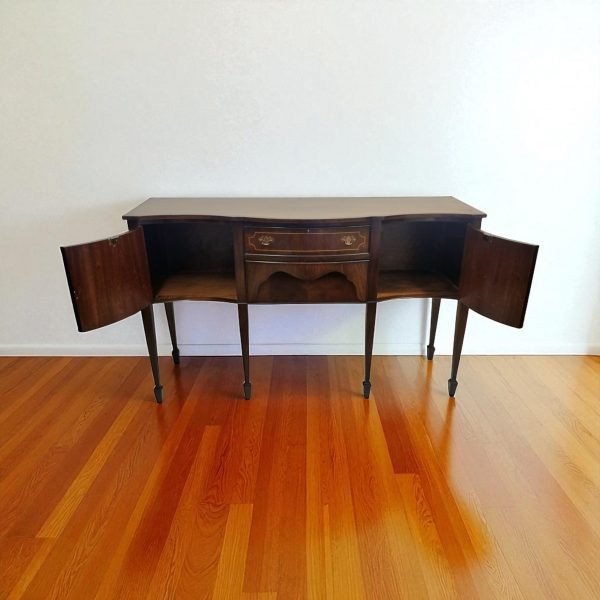 The piece is beautifully proportioned, featuring a serpentine front with central drawer and arched apron, flanked by two cupboards.