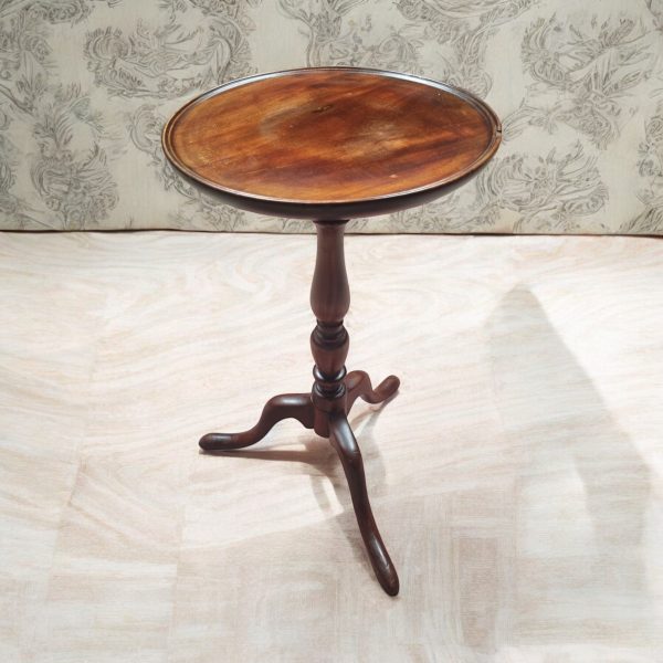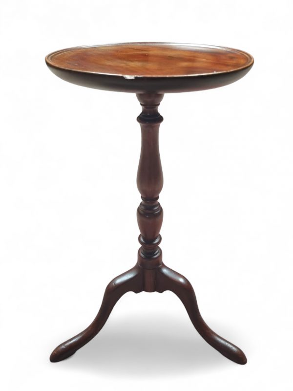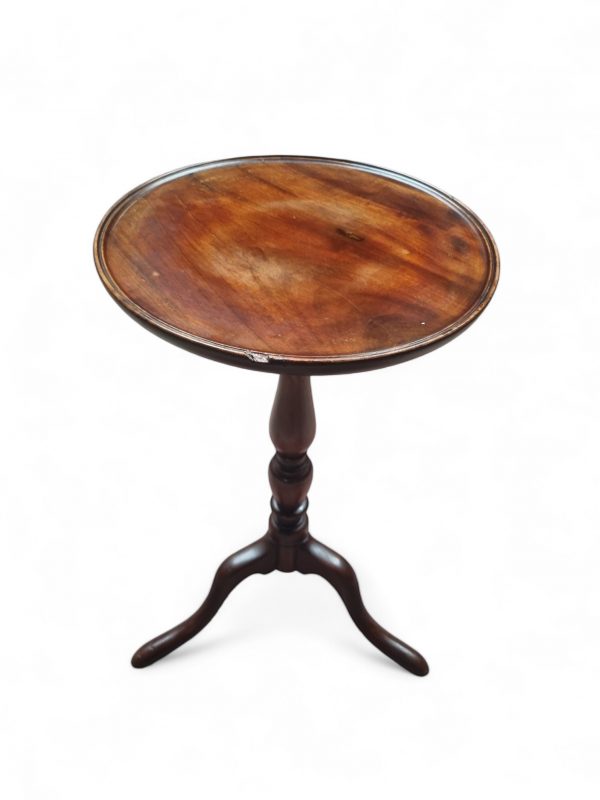 The piece features a circular top with moulded edge, raised on a turned column and supported by three elegantly curved legs.