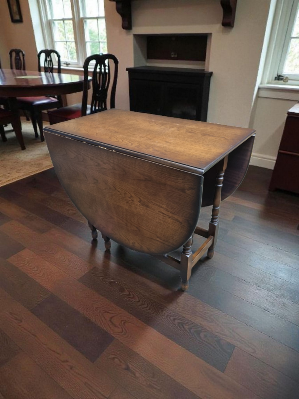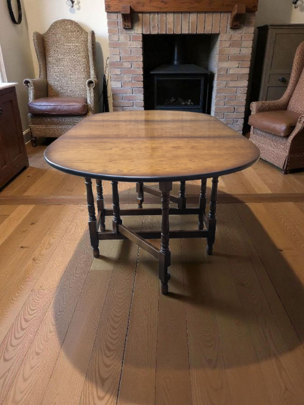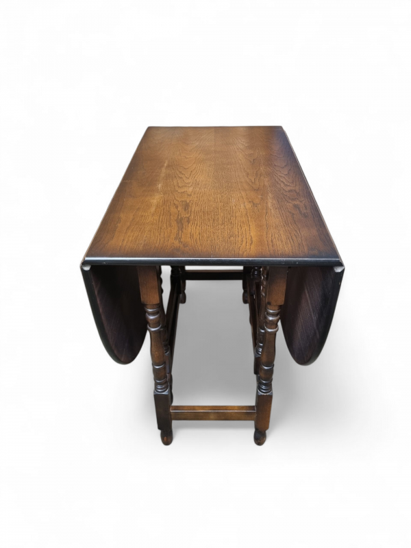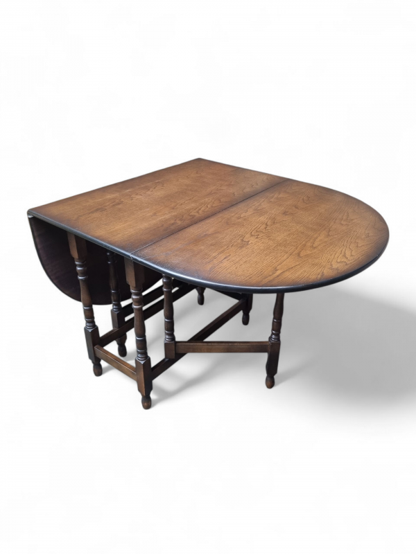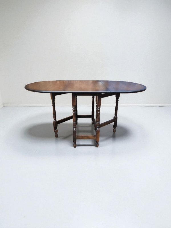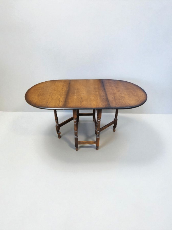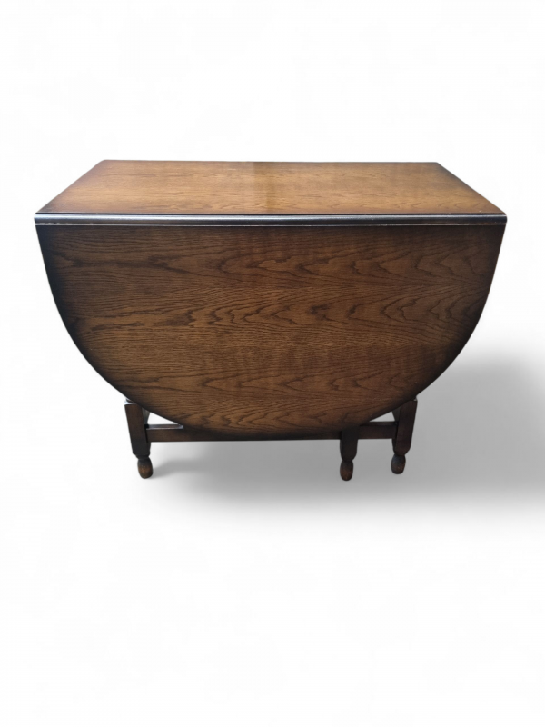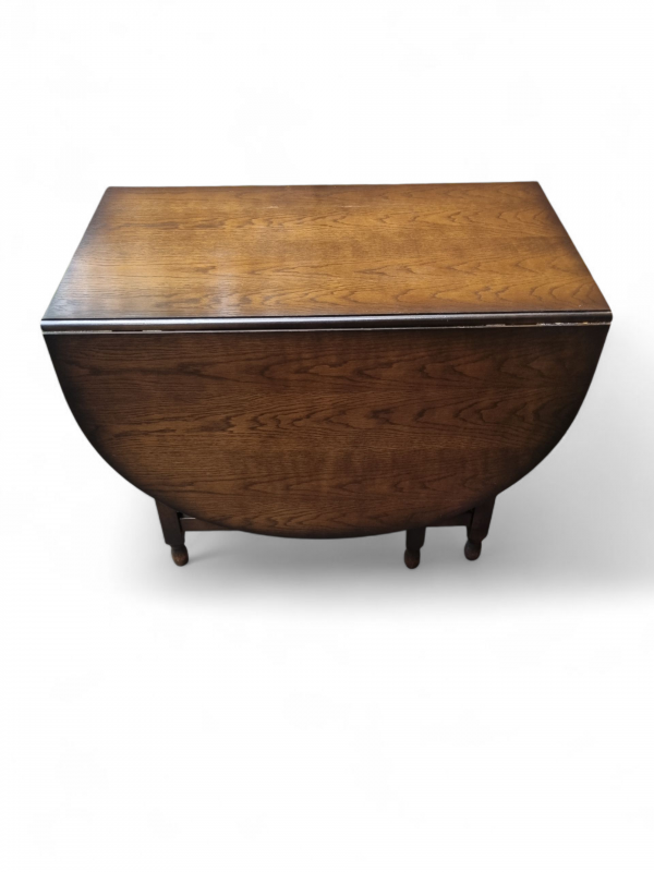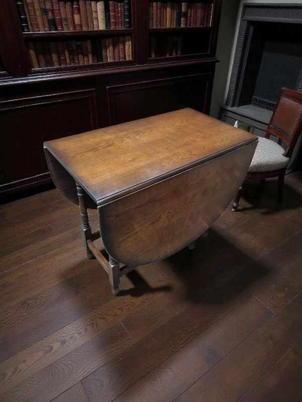 The warm oak patina highlights the natural beauty of the timber, while the gateleg mechanism operates smoothly, reflecting the quality craftsmanship of the period.