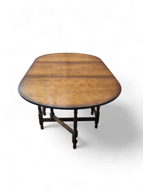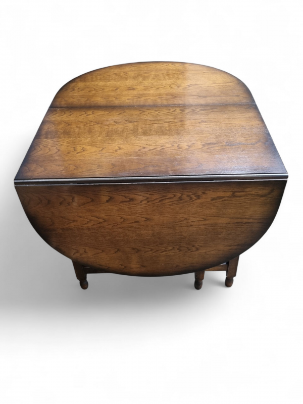 A charming oak gateleg dining table, featuring a beautifully grained oval top and traditionally turned legs united by stretchers for added strength.