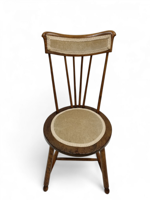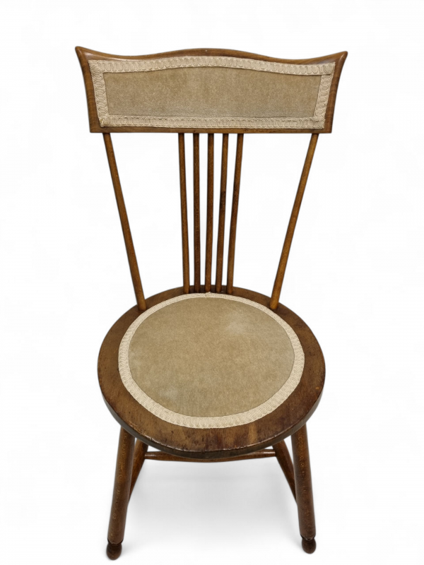 The backrest with upright turned spindles; the seat penny shaped and fabric to the centre and grooved at the front; on tapered turned legs.
