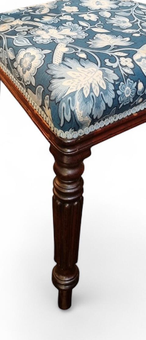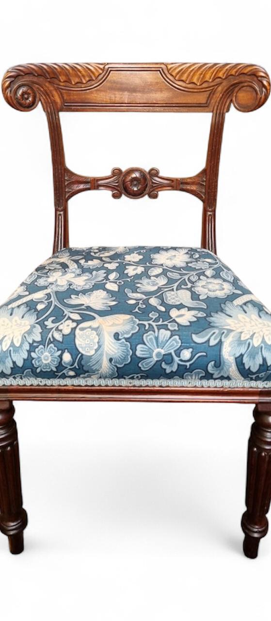 The seat is traditionally upholstered in a blue floral fabric, adding a refined contrast to the warm patina of the mahogany.