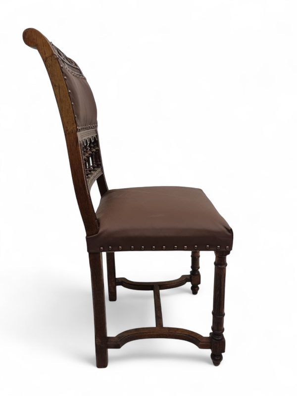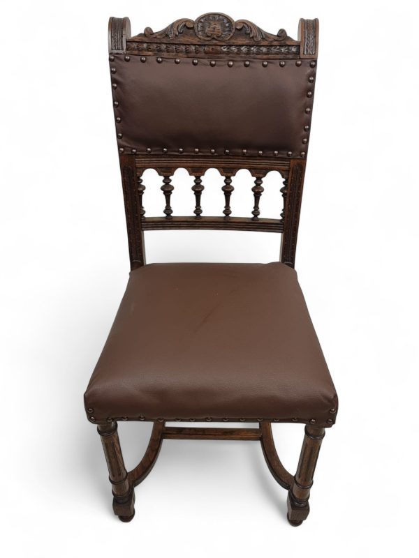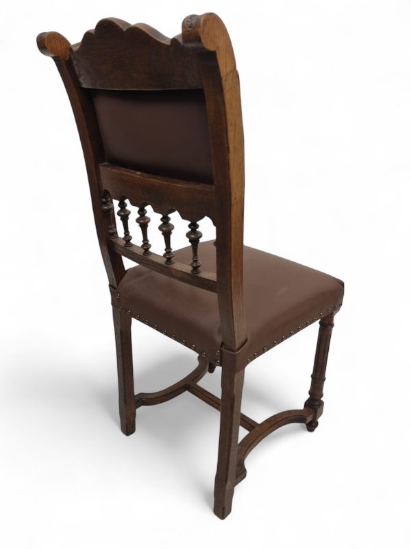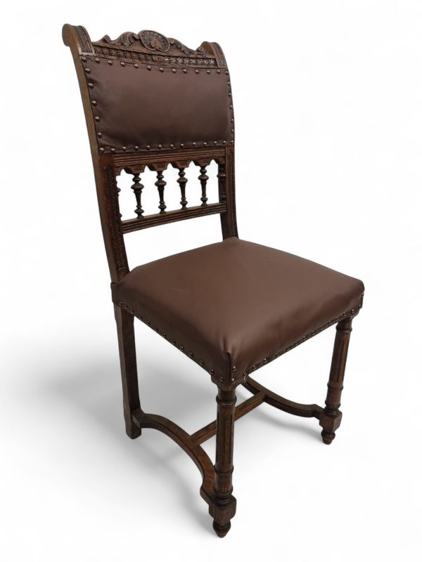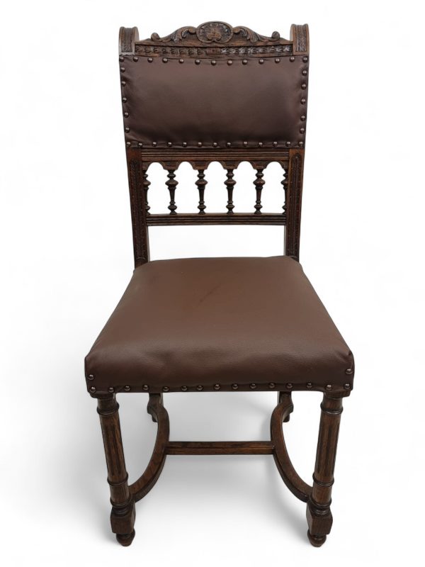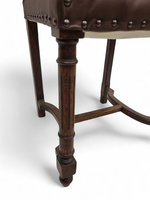 The seats and backs have been newly reupholstered in dark brown faux leather, finished with traditional brass studs, combining comfort with historic character.
