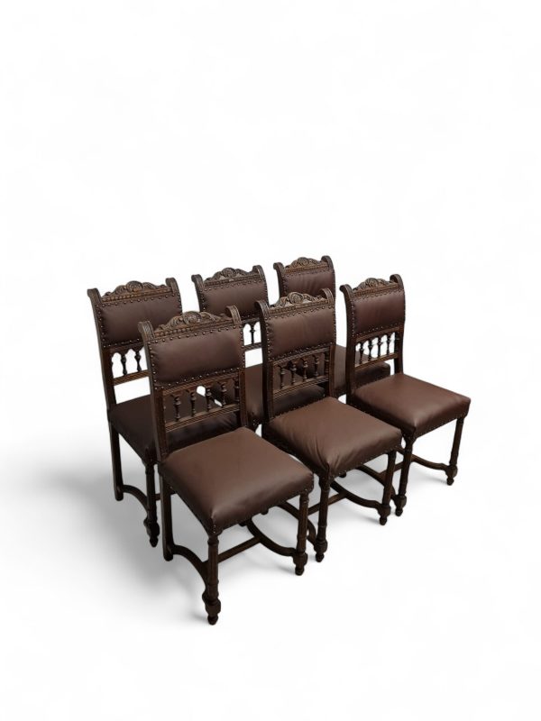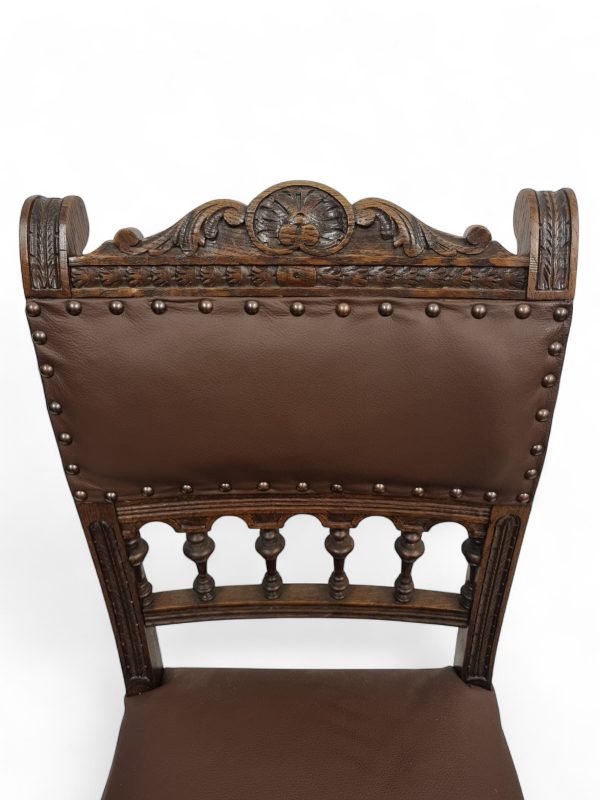 A fine set of six antique dining chairs in the Renaissance Revival style, dating from the late 19th to early 20th century. Crafted in oak, each chair is richly carved with decorative cresting and turned spindles to the backrest, showcasing quality craftsmanship of the period.