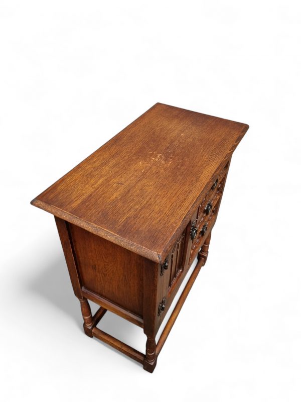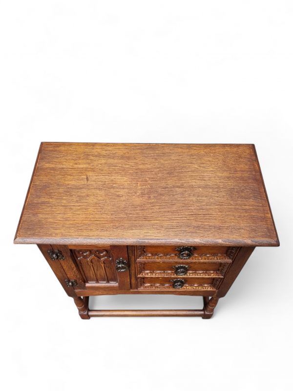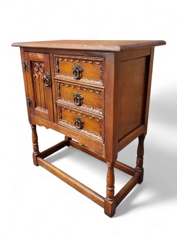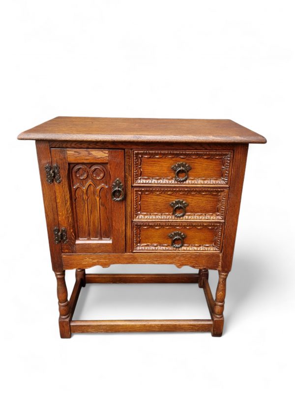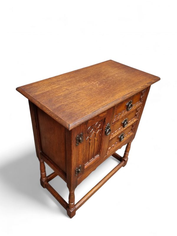 The cabinet features a panelled cupboard door with carved Gothic tracery, alongside three carved drawers with decorative brass drop handles.
