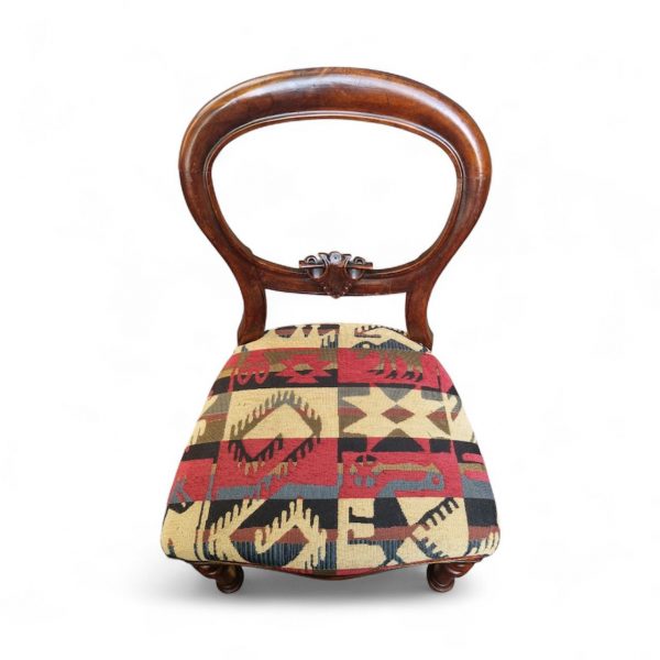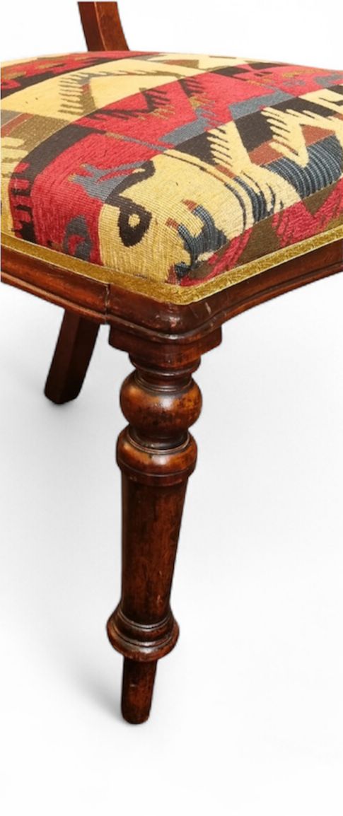 The chair has been tastefully reupholstered in a vibrant tapestry fabric featuring geometric and abstract patterns, giving this antique piece a striking contemporary character while retaining its period charm.