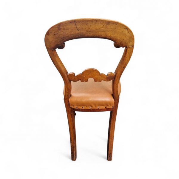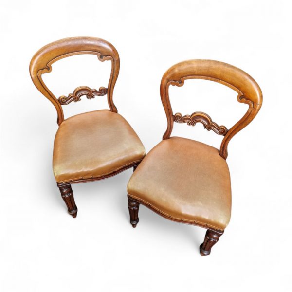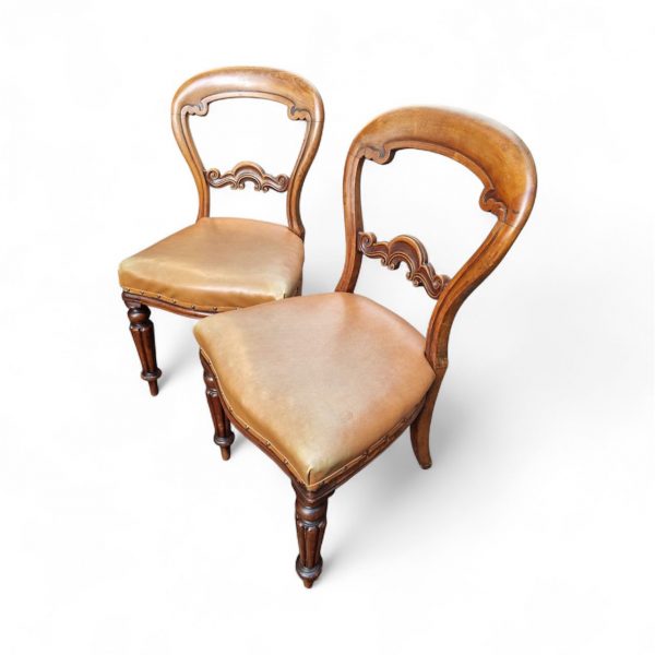 Each chair features an elegant balloon-shaped backrest with a decorative scrolled centre rail and finely turned front legs.
