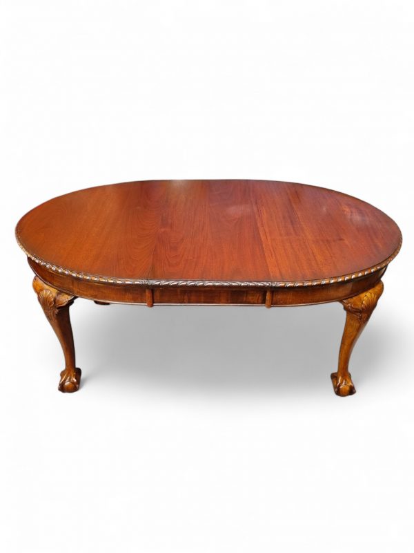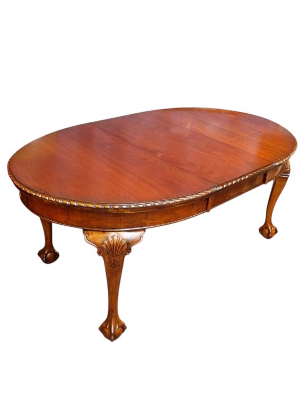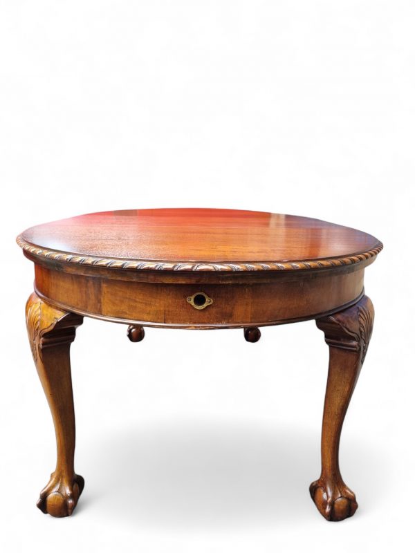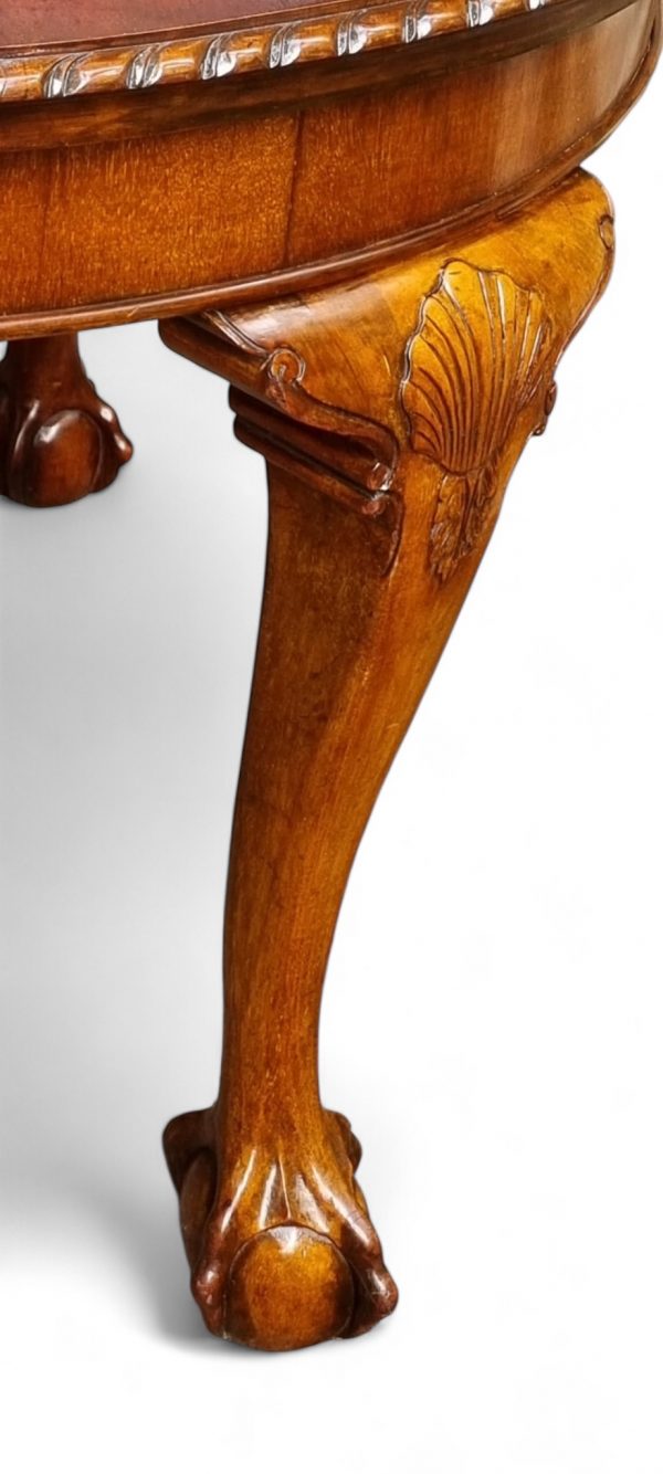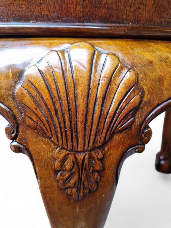 The table rests on four beautifully carved cabriole legs with shell motifs to the knees and striking lion paw feet, adding elegance and character.