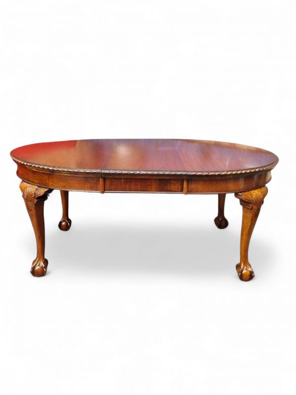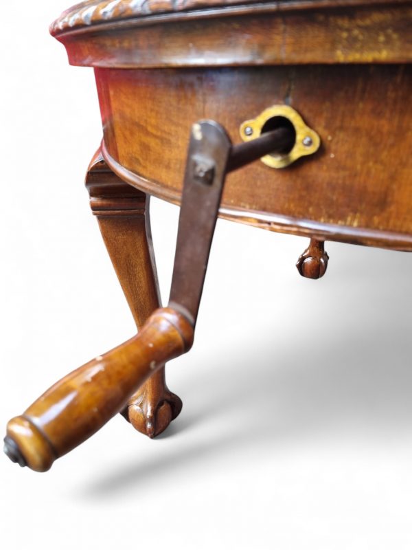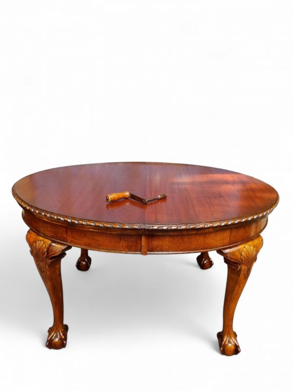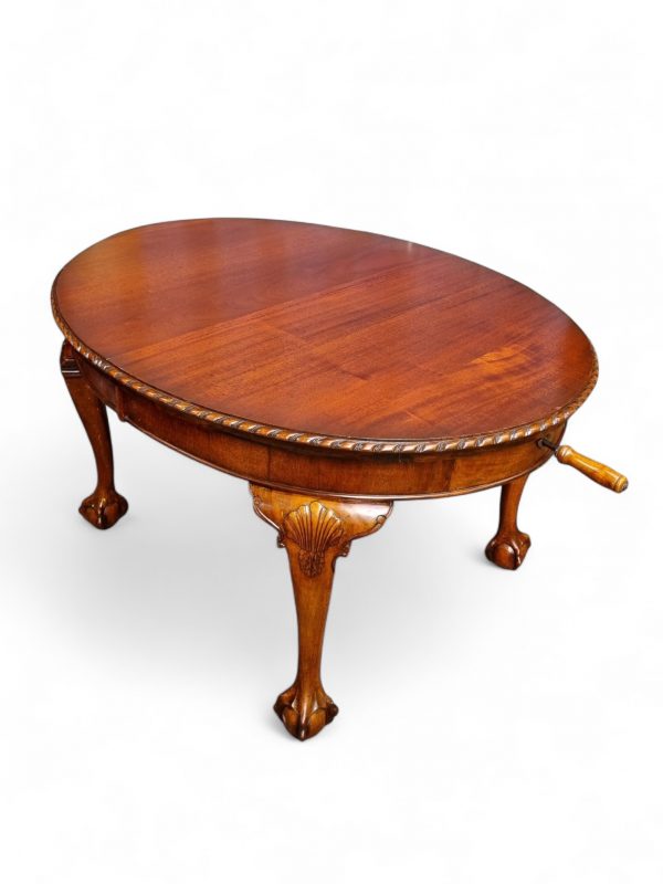 The warm mahogany surface opens smoothly with the original winding handle, allowing for the insertion of an additional leaf to extend the dining space when required. The craftsmanship and decorative details highlight the quality of this timeless piece, which remains in excellent condition for its age.