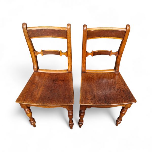 Each chair features a solid oak seat, turned front legs, and a shaped back support with a decorative central stretcher, adding both style and stability.