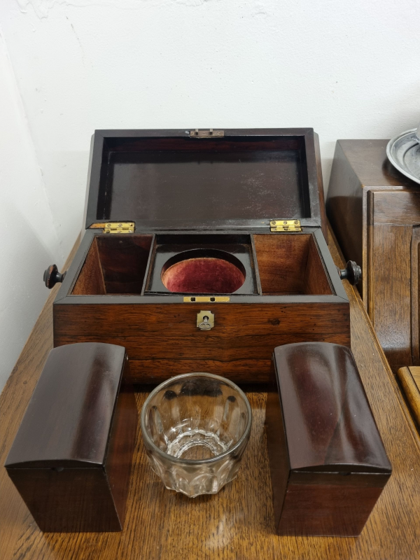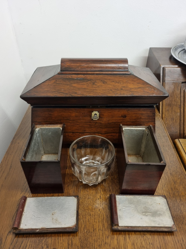 The Caddy of classical sarcophagus form, the hinged lid with a tablet top, and sloped sides, opening to reveal a pair of lift out tea canisters, and a mixing bowl.