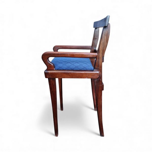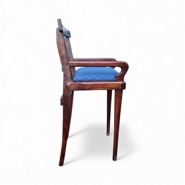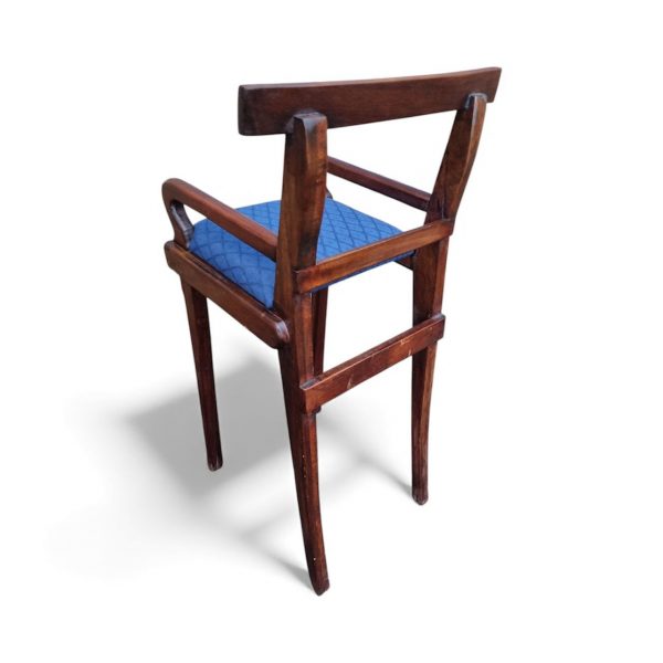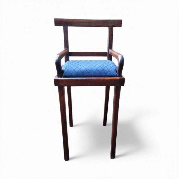 Despite its small footprint, the chair is solid and stable, with a neatly upholstered blue seat.