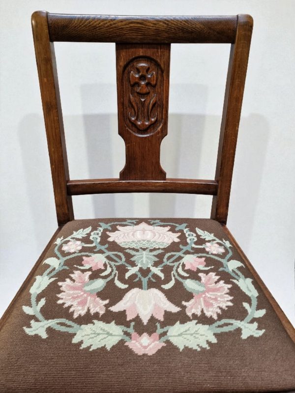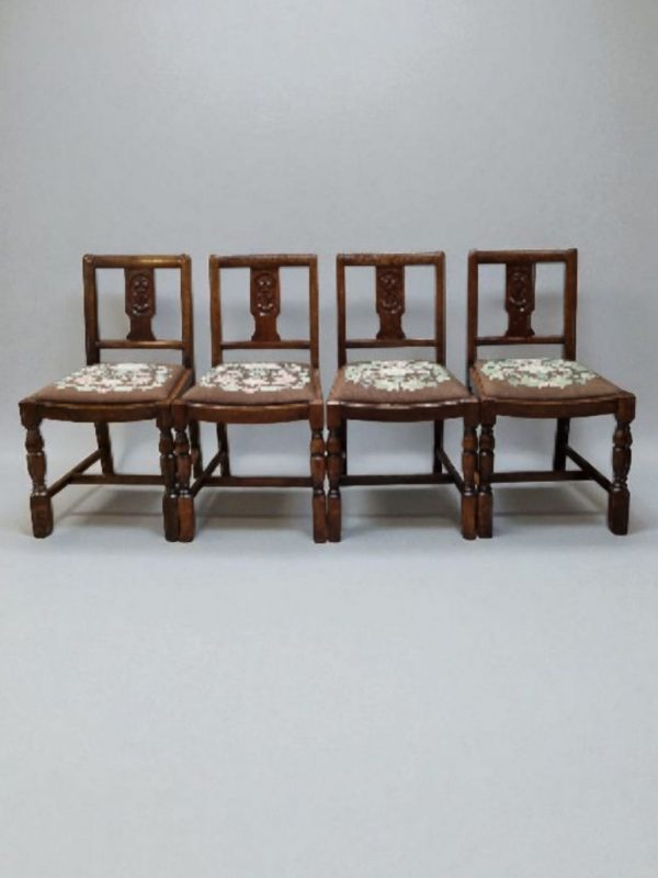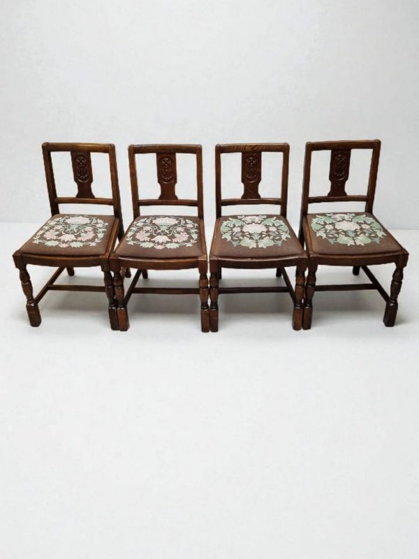 Vintage Art Deco Oak Dining Chairs / Tapestry Seats / Set of Four / c. 1930–1940 / FREE DELIVERY