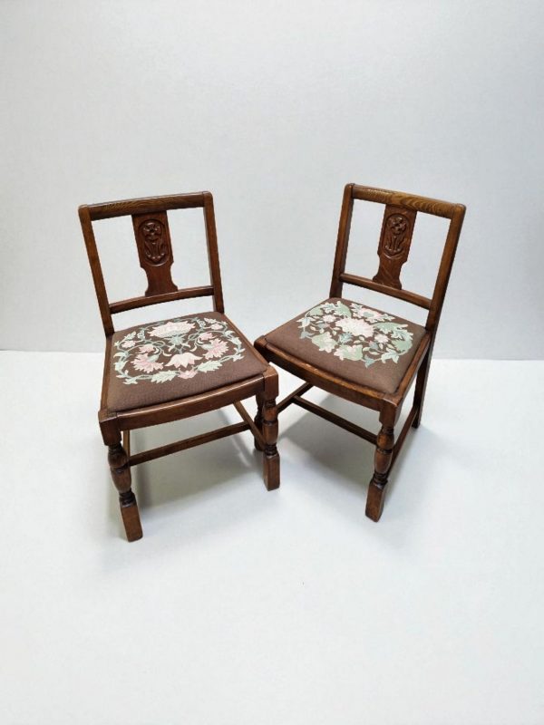 Each chair has a solid oak frame with a carved central back splat and turned front legs, giving a lovely subtle Art Deco / late Arts & Crafts feel.