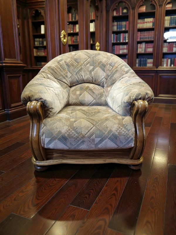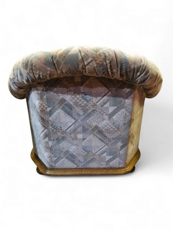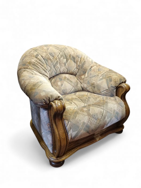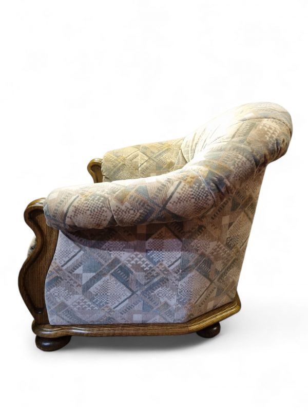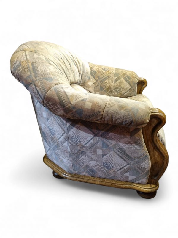 The upholstery features a subtle geometric pattern in muted tones, paired with solid carved wooden arms and base a great statement piece for a living room, snug, reading corner or boutique interior.