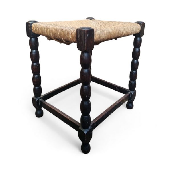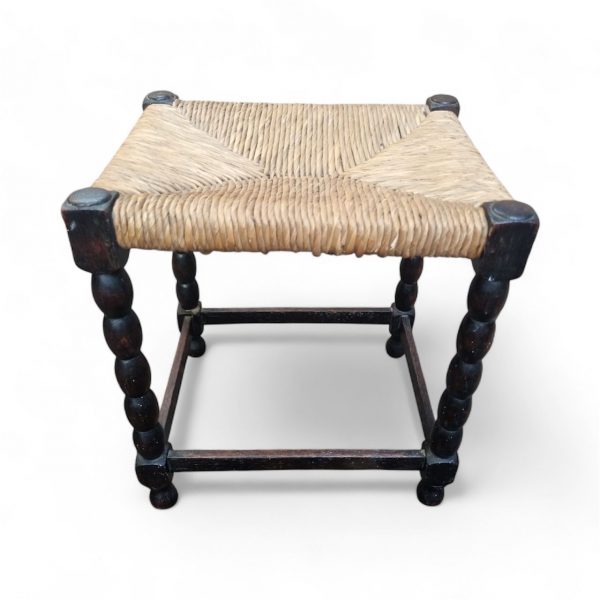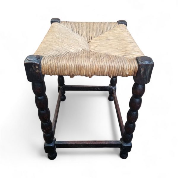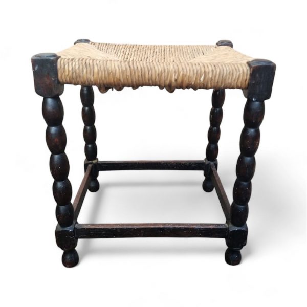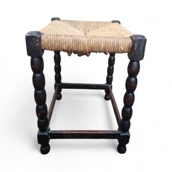 Charming vintage stool dating from around the 1950s, featuring a traditional hand-woven rush seat and beautifully turned bobbin legs joined by square stretchers.