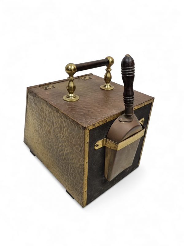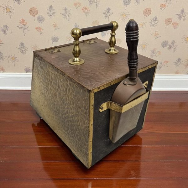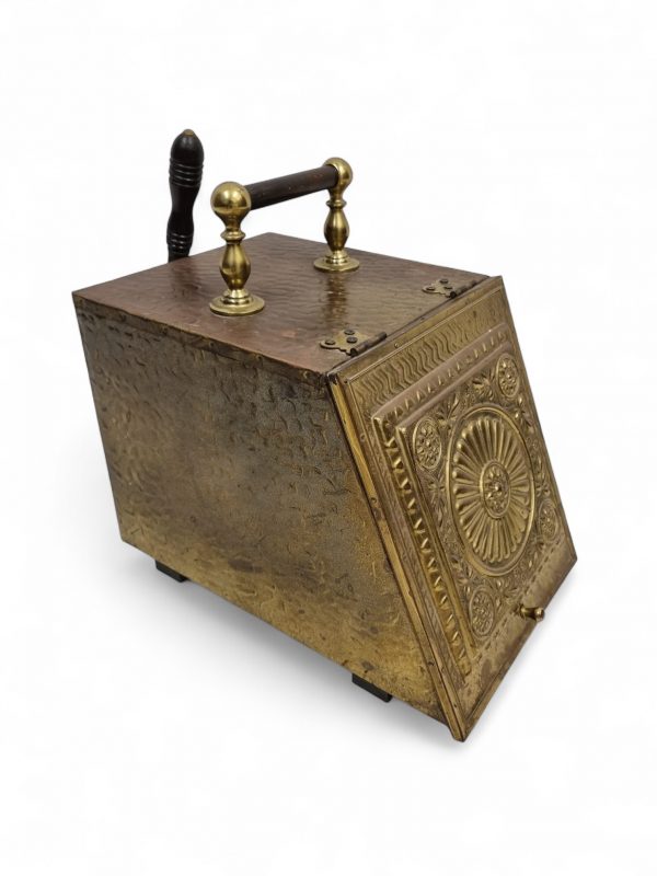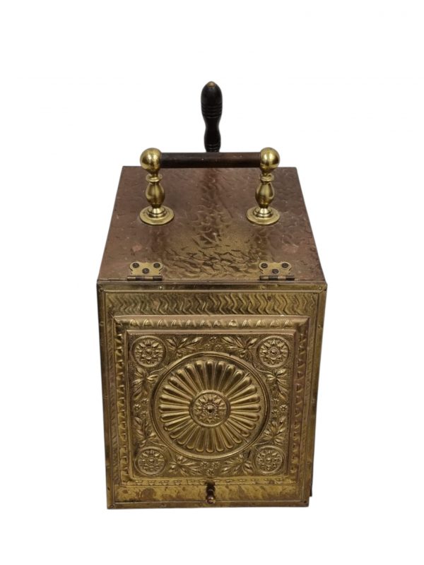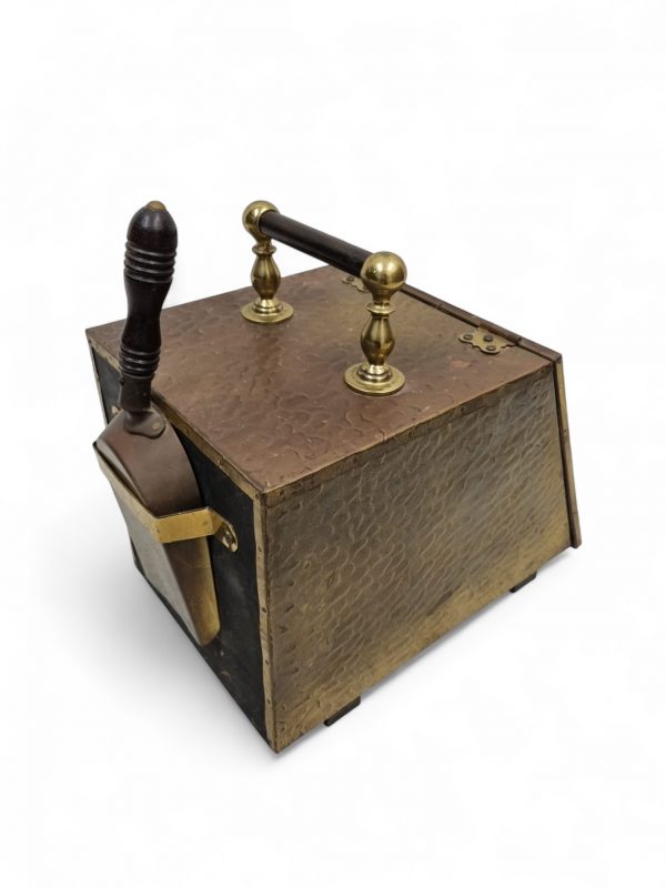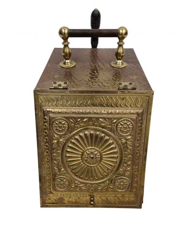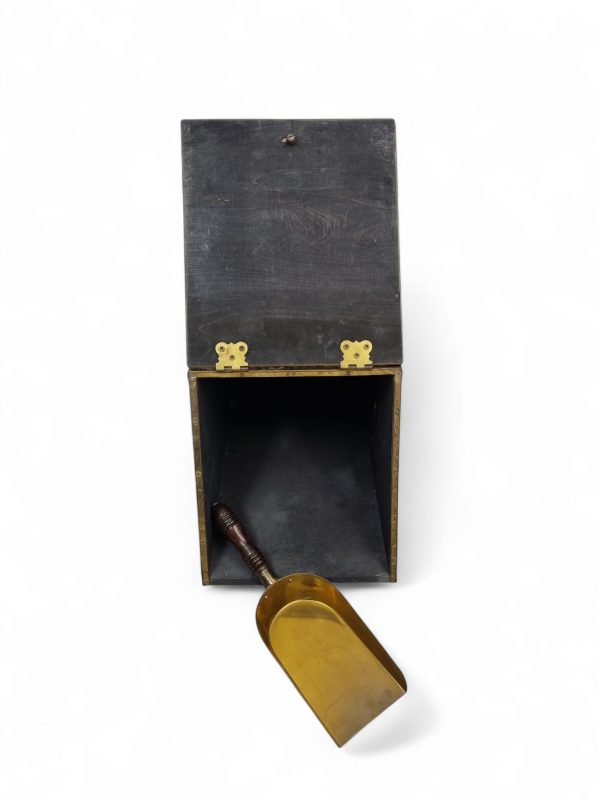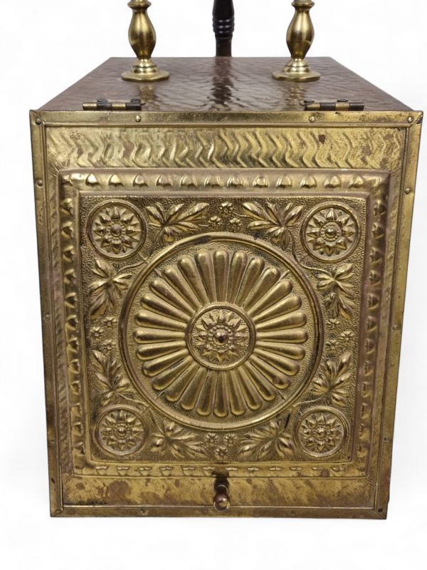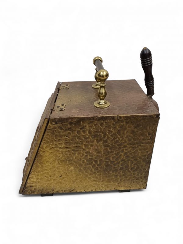 Vintage brass coal scuttle having A quality brass embossed Iift up lid 2 ll opening to reveal a storage compartment for coal, pretty ornate brass carrying handle with the original brass shovel and raised.