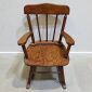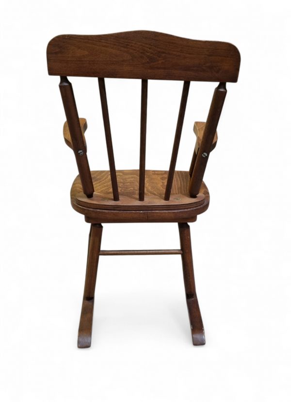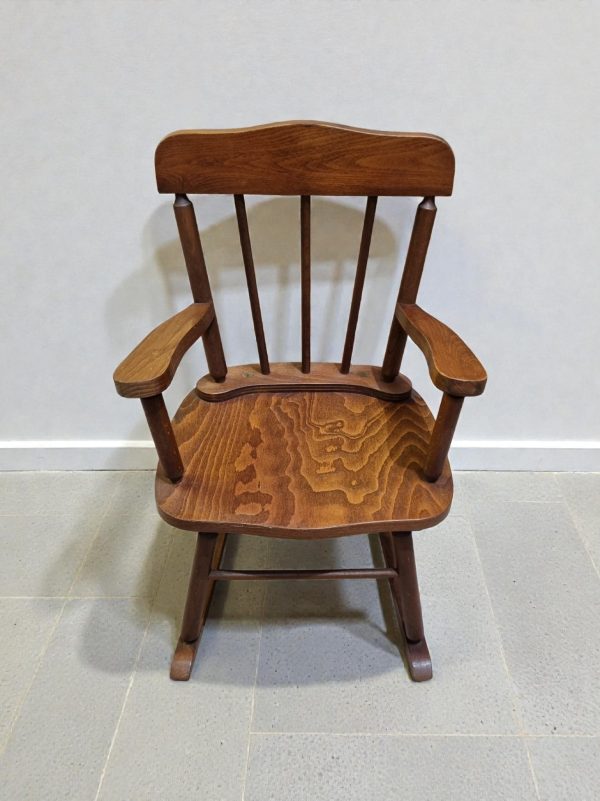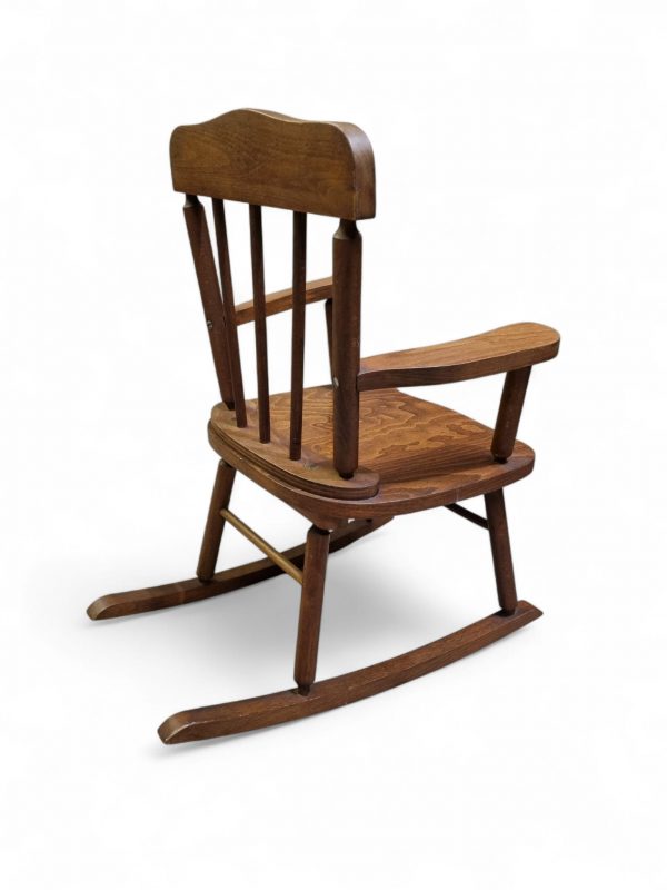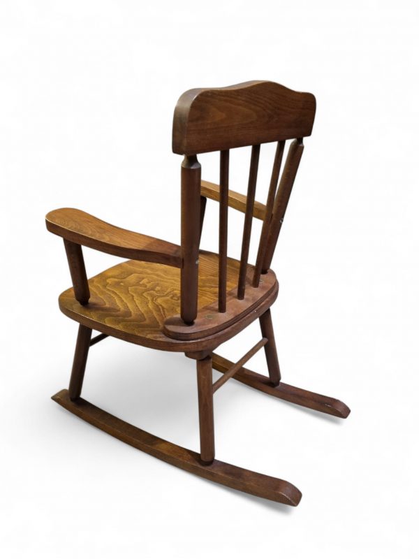 A charming vintage children’s rocking chair, crafted from solid wood and finished in a warm natural tone.
