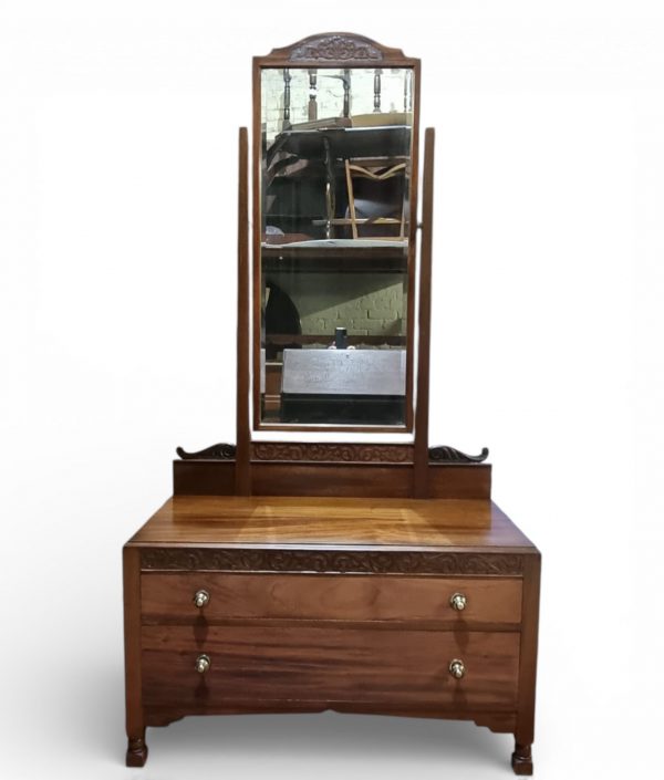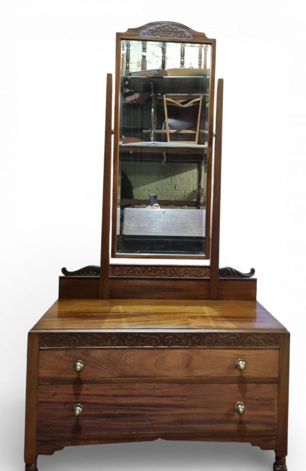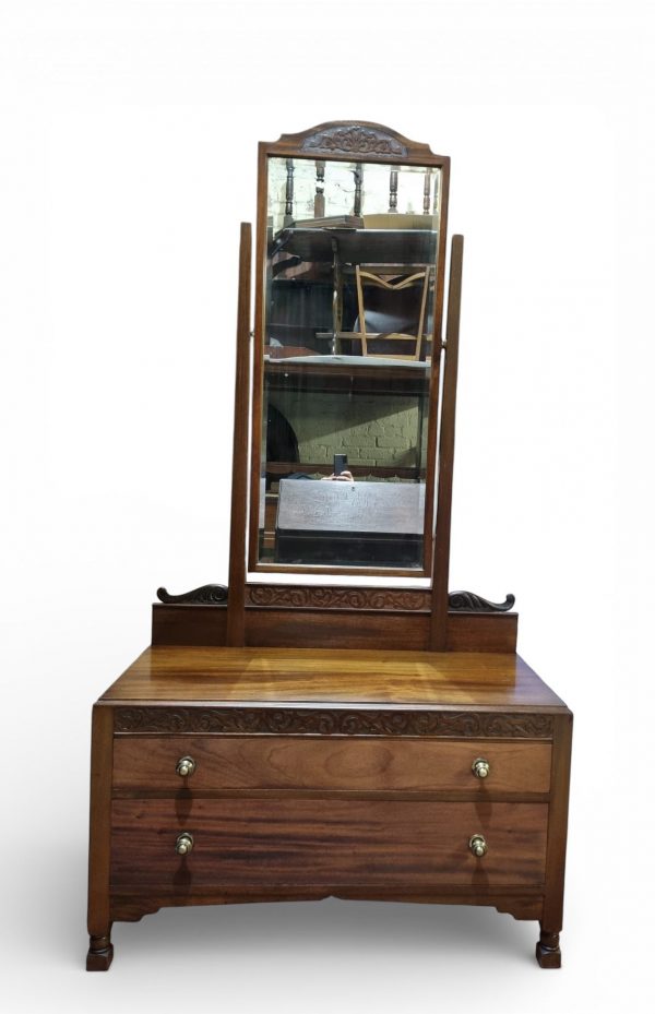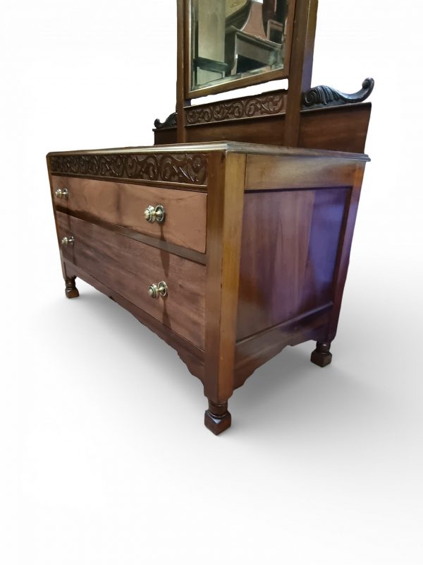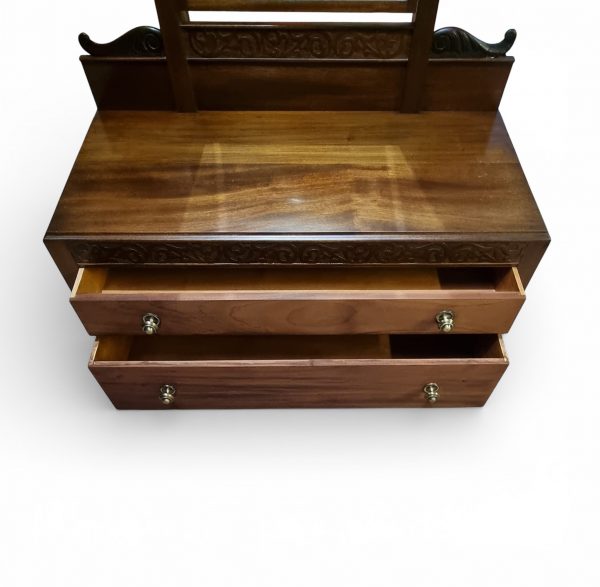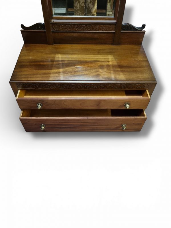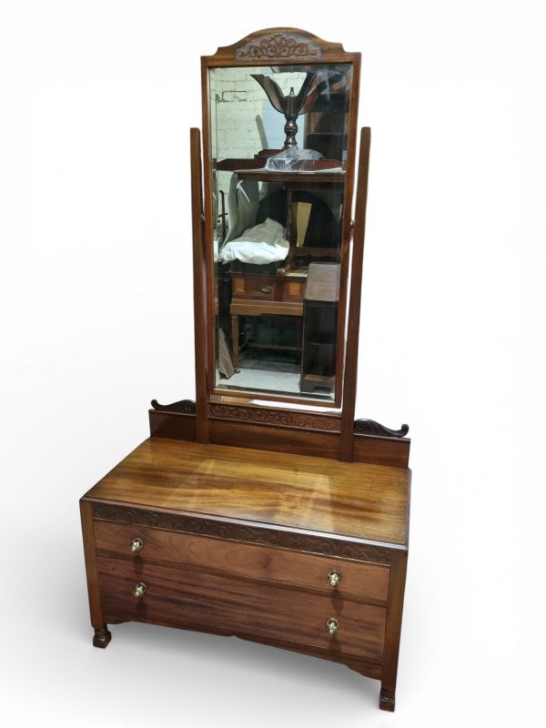 A beautiful vintage dressing chest with tall mirror, crafted in richly toned wood and decorated with traditional carved detailing typical of classic English furniture.