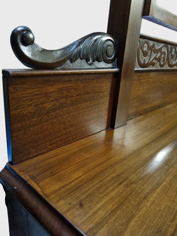 Above sits the original tall mirror frame with carved crest and elegant side supports, giving the piece strong presence and making it ideal for use as a dressing table or bedroom chest.