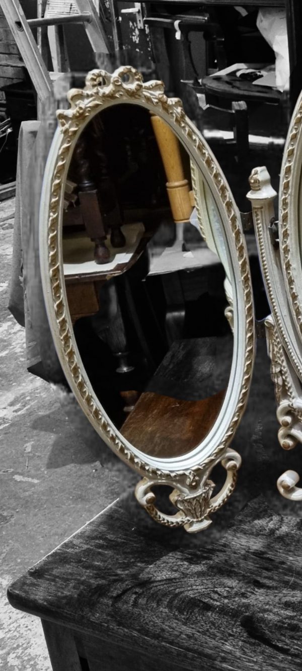 The frame stands on elegant scrolled feet, giving the piece a very decorative, feminine look – perfect for a vintage bedroom, dressing table or boutique interior.