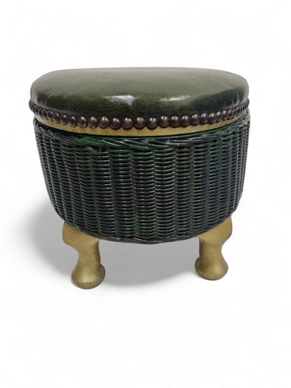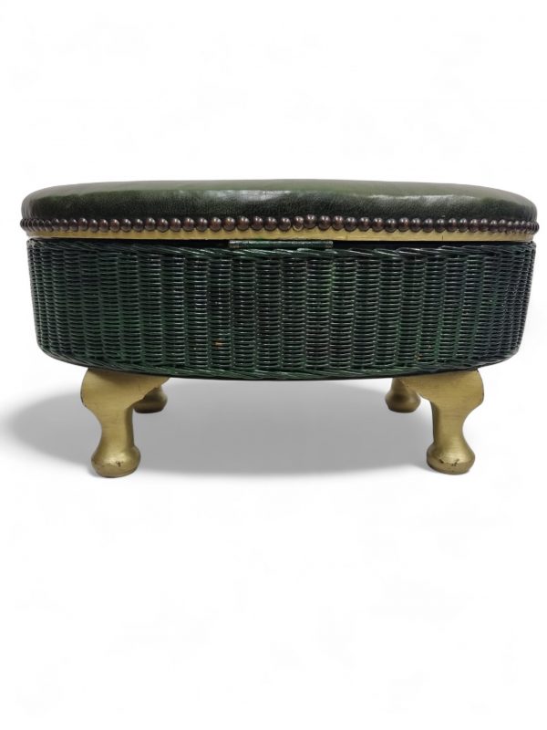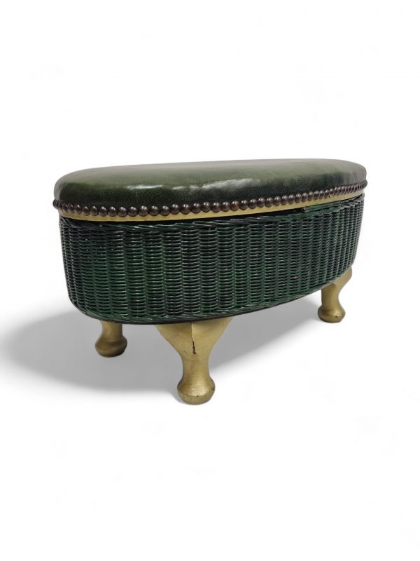 The oval-shaped piece is finished in green, with woven wicker sides, a padded top in matching green vinyl, and decorative stud trim.