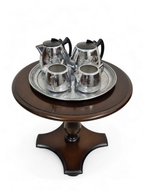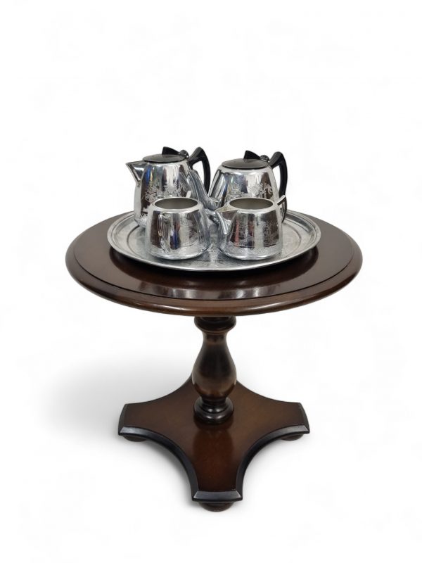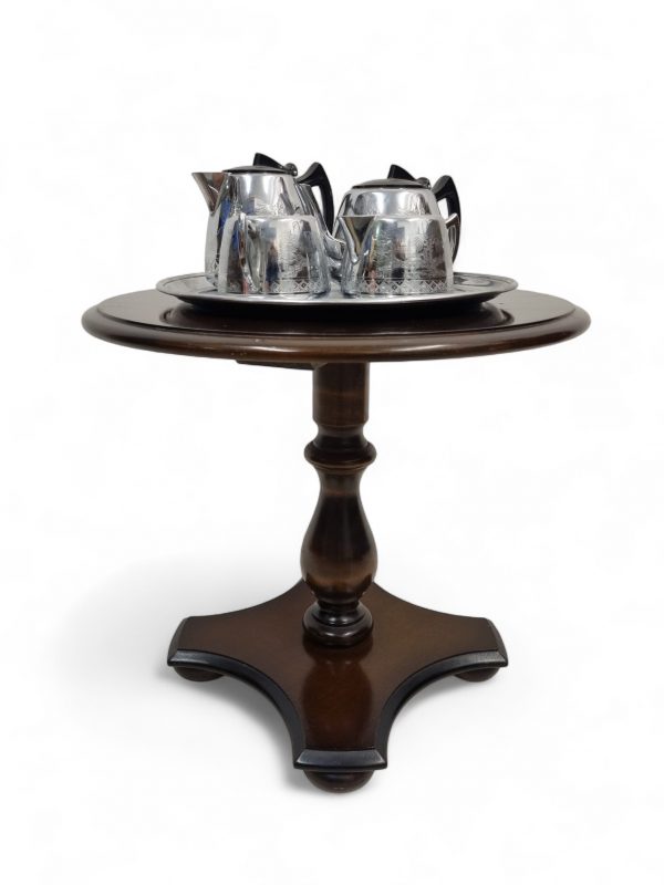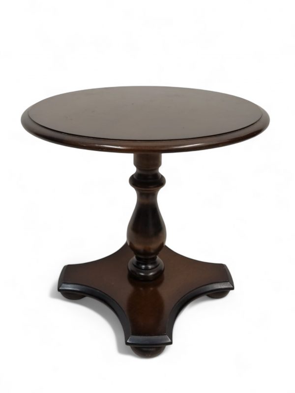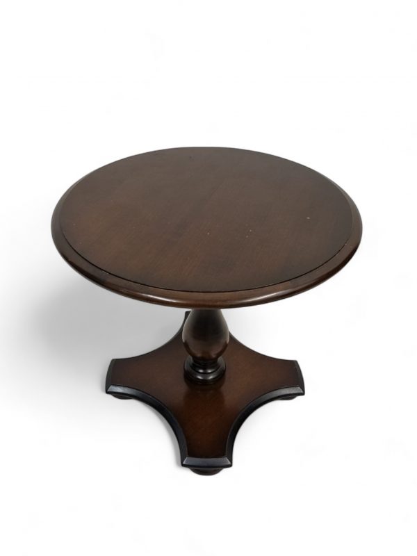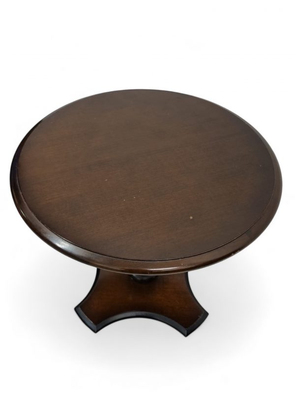 This charming piece features a round top set on a turned central pedestal, resting on a shaped base for stability and character.