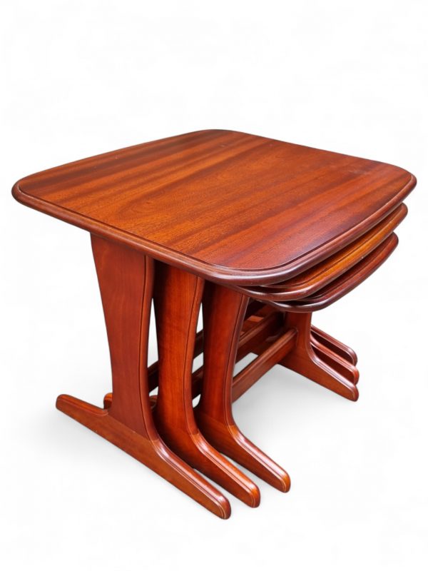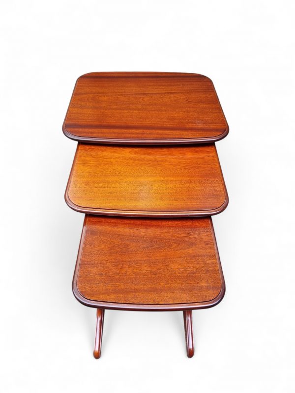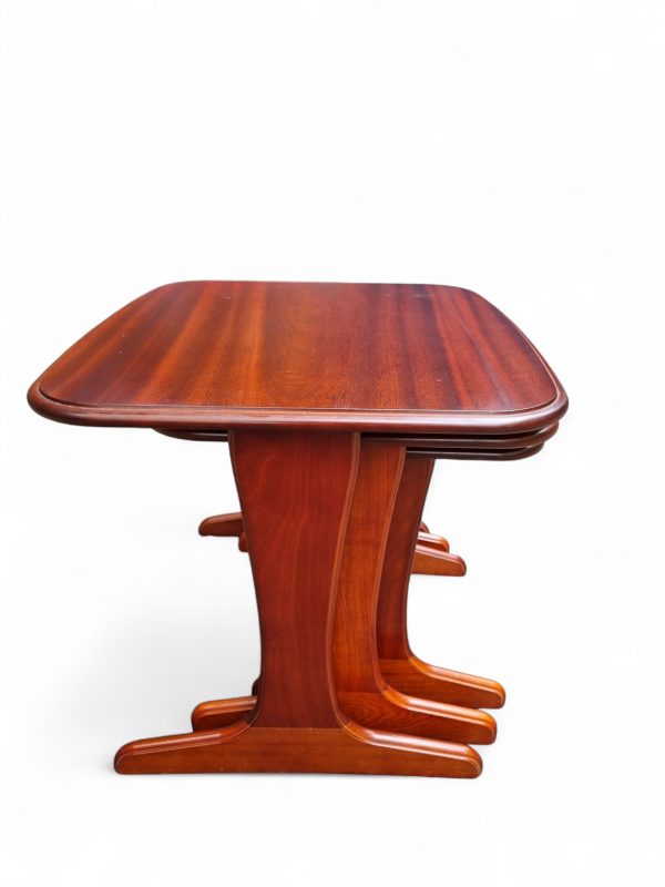 This practical and elegant set comprises three graduated tables, each neatly sliding beneath the other when not in use. The largest table stands on a distinctive sleigh-style base with smooth, rounded edges, typical of mid-century design.