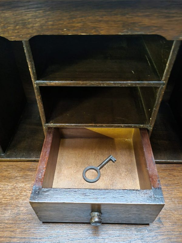 Very Good vintage condition with light surface wear consistent with age. A functional and decorative oak desk ready for everyday use.
