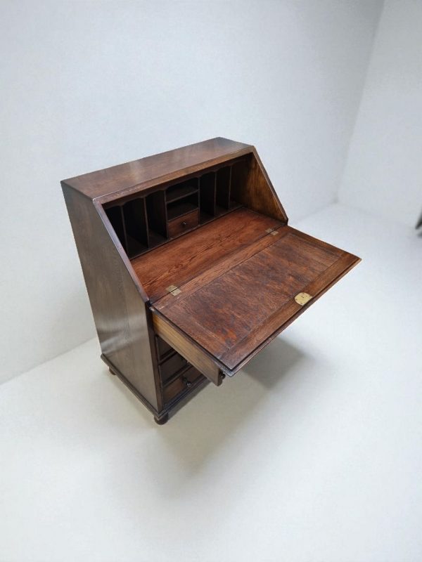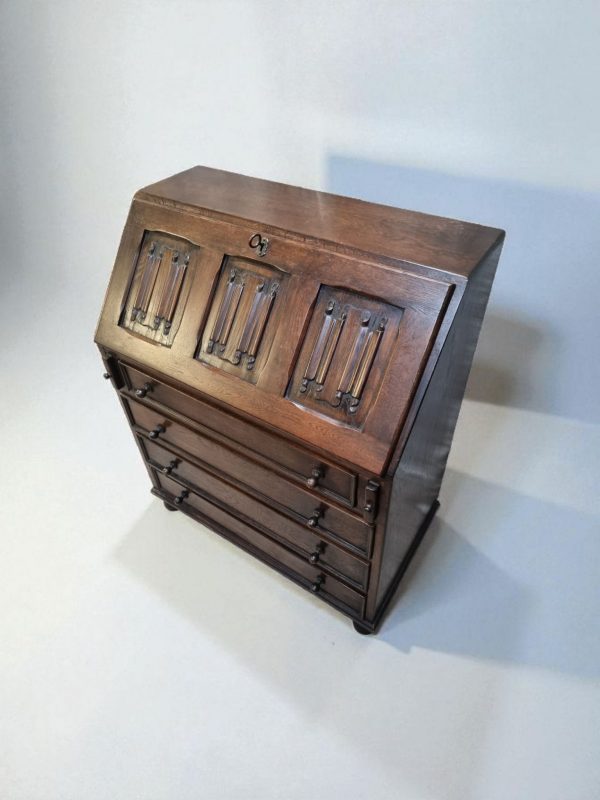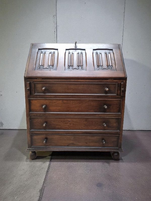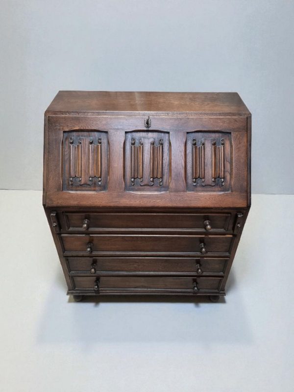A characterful 1970s solid oak bureau featuring four smooth-running drawers and a beautifully carved fall-front panel.