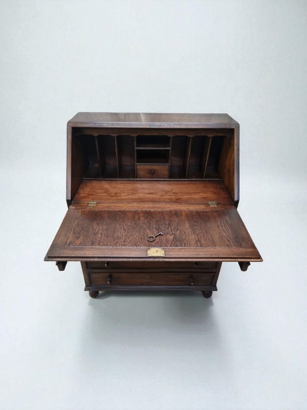 The bureau stands solid and stable, retaining its original key, which operates the fall-front lock.