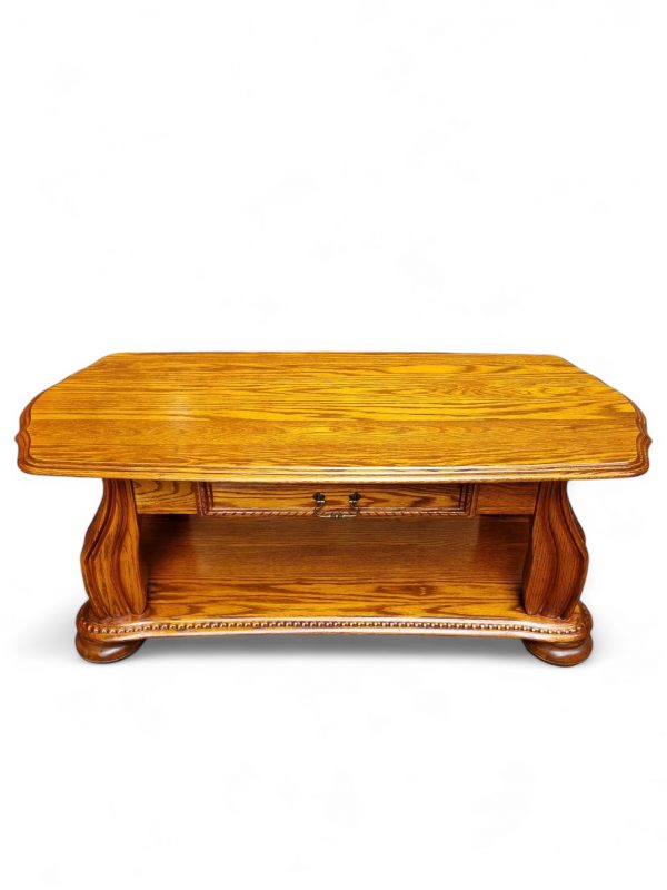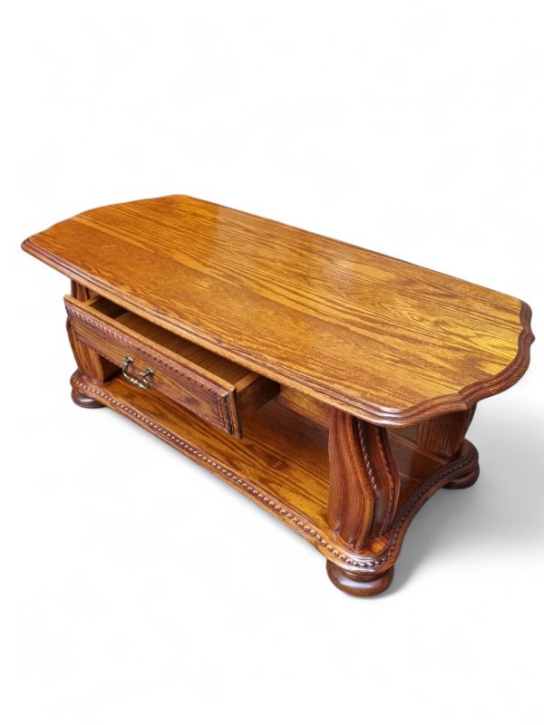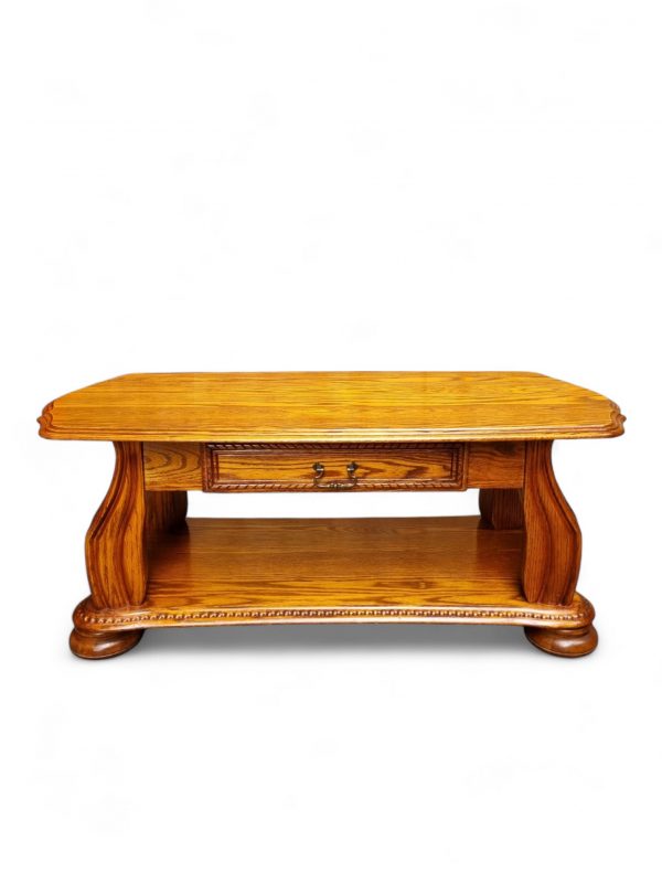 A solid vintage oak coffee table dating from the 1970s, designed in a traditional style. This heavy and well-crafted piece features a rectangular top with moulded edges, supported by shaped legs united by a lower shelf. The table is fitted with a central drawer with brass handles, adding both practicality and charm.