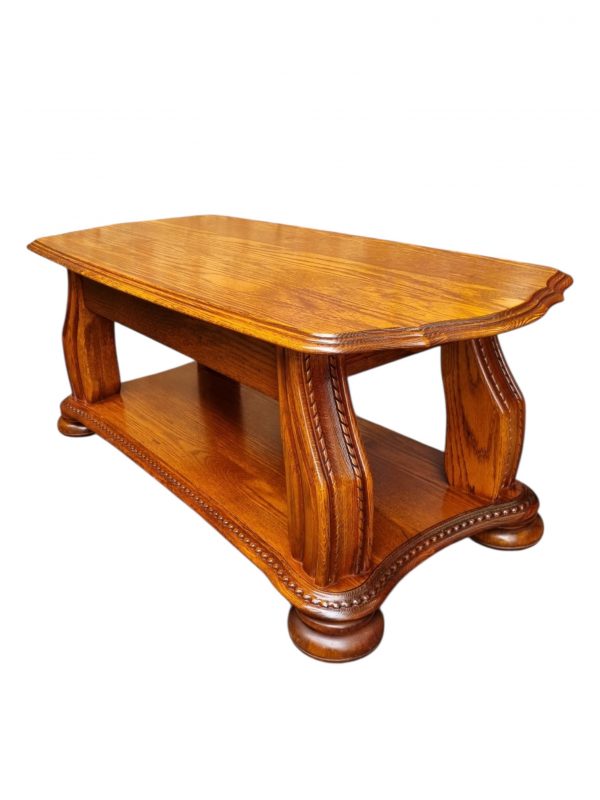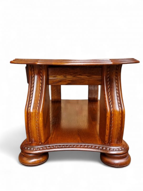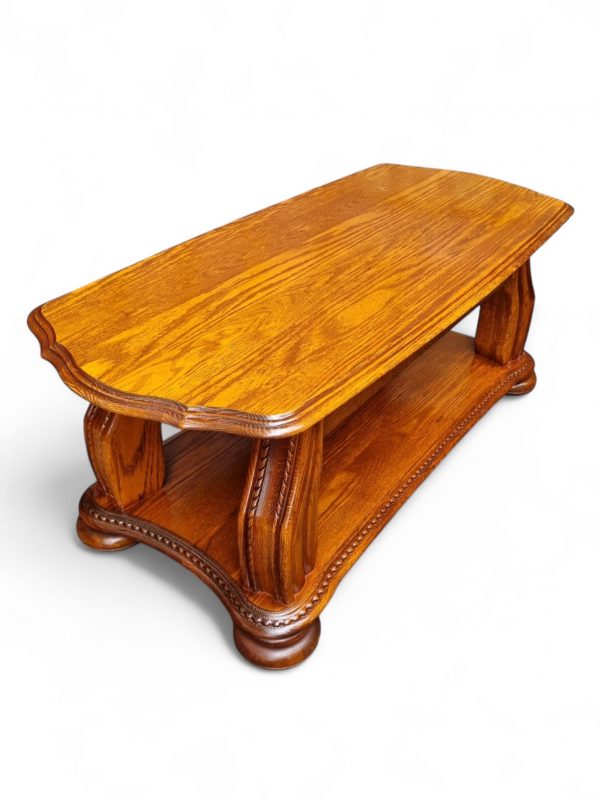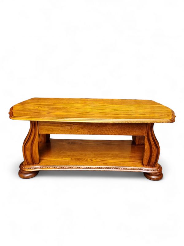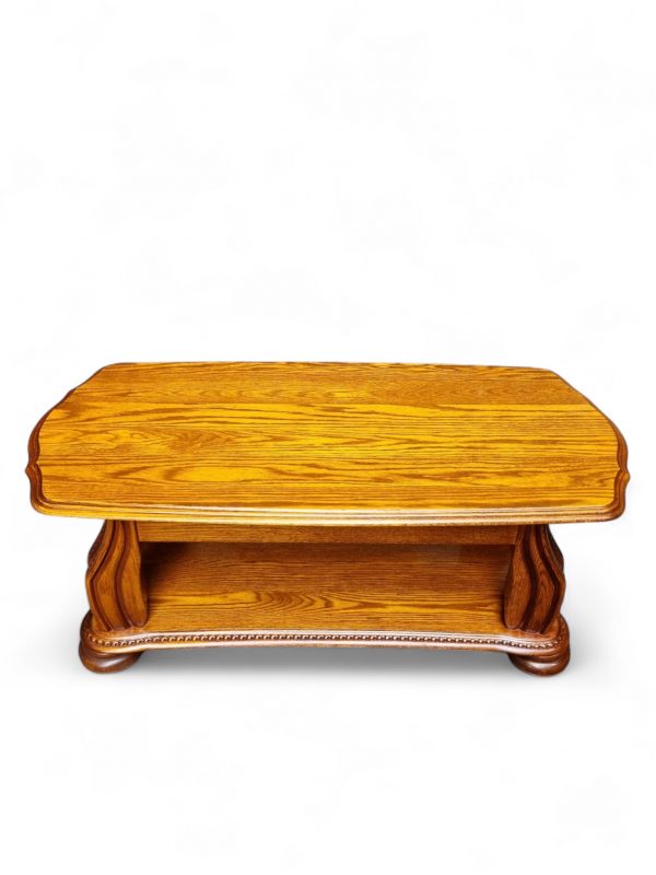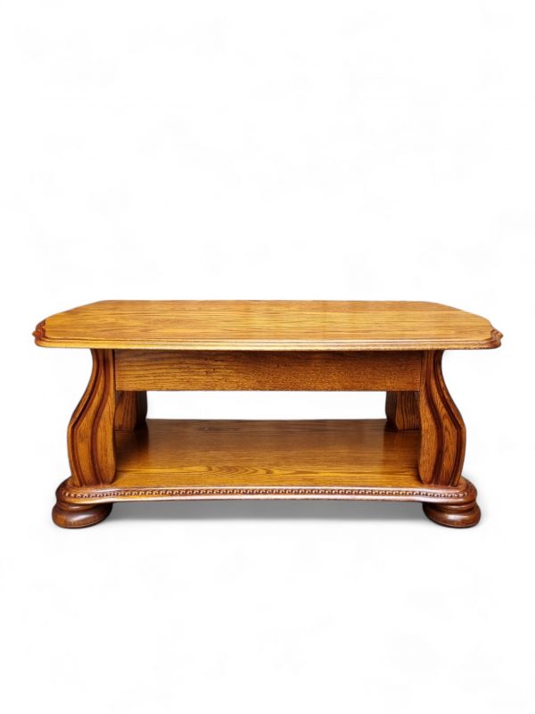 The warm golden oak finish highlights the natural grain of the wood, while the decorative moulding to the base enhances its classic character. Sturdy and versatile, this table is ideal for a living room, providing both display and storage space.
