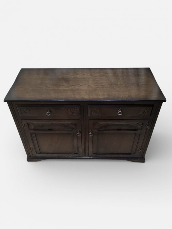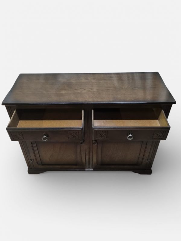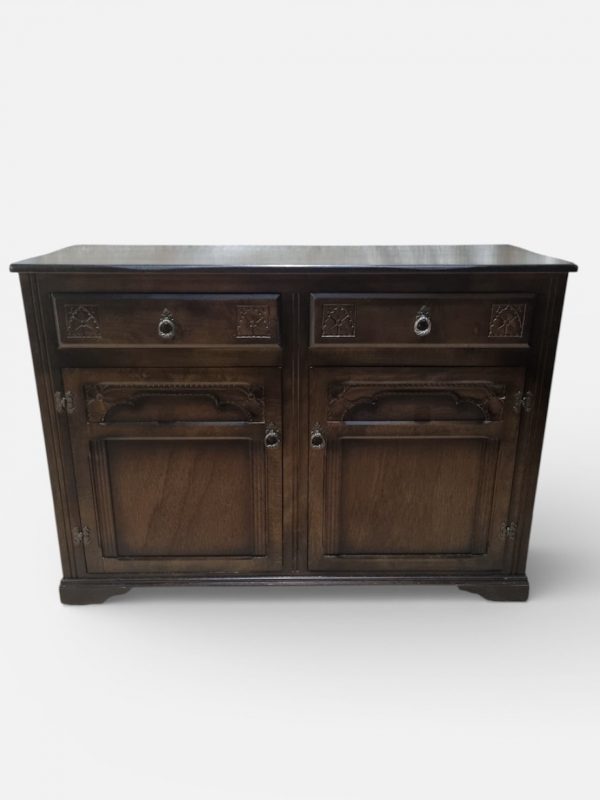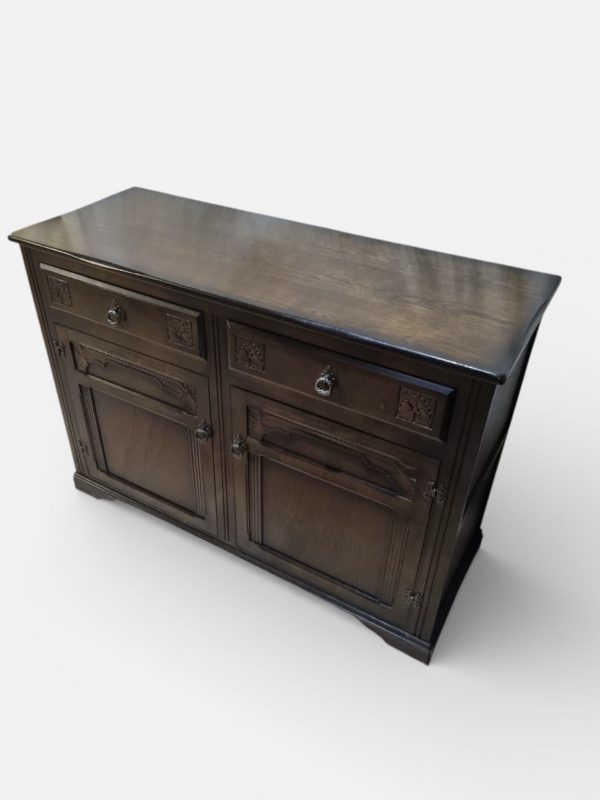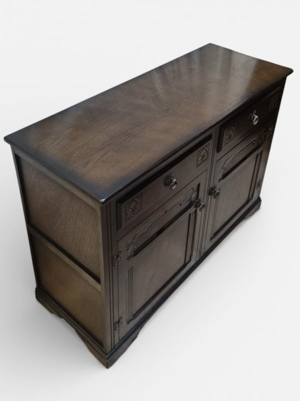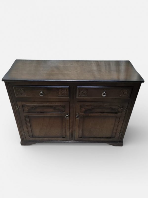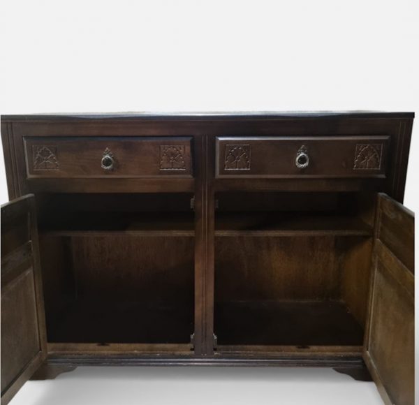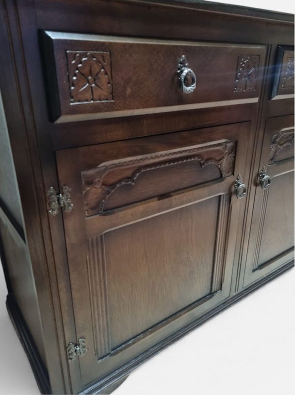 The sideboard features two drawers above two cupboard doors, each panelled and enriched with carved decorative motifs.