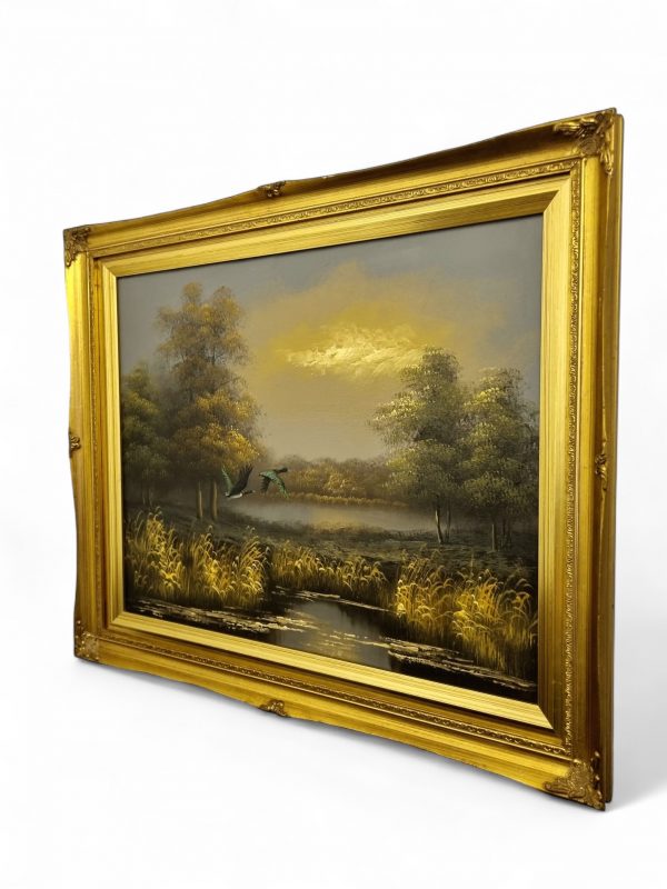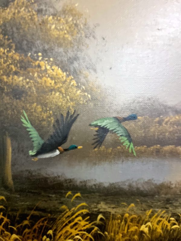 Vintage Oil Painting on Canvas / Landscape with Ducks in Flight / c1970 / FREE DELIVERY
