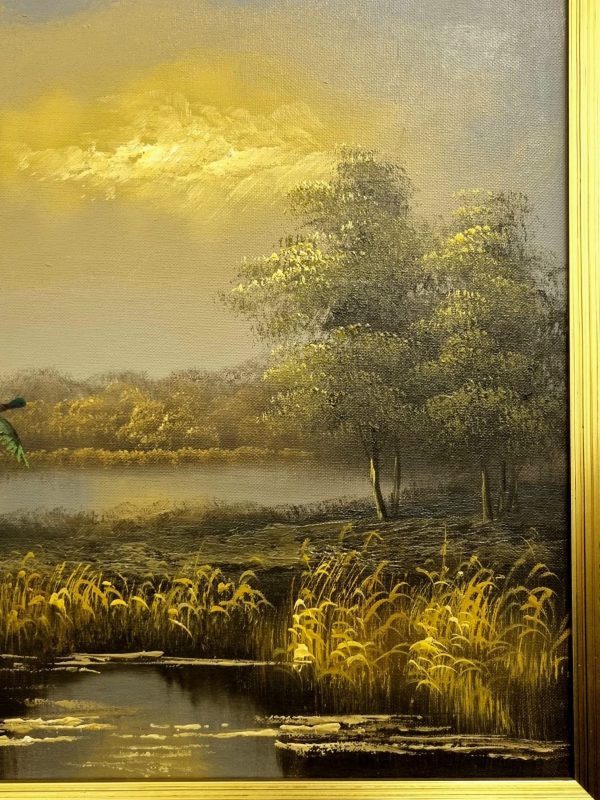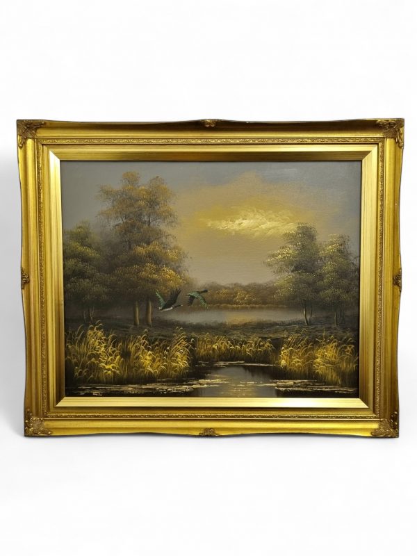 A charming vintage oil painting on canvas, depicting a tranquil riverside landscape with trees and reeds, highlighted by two ducks in mid-flight.