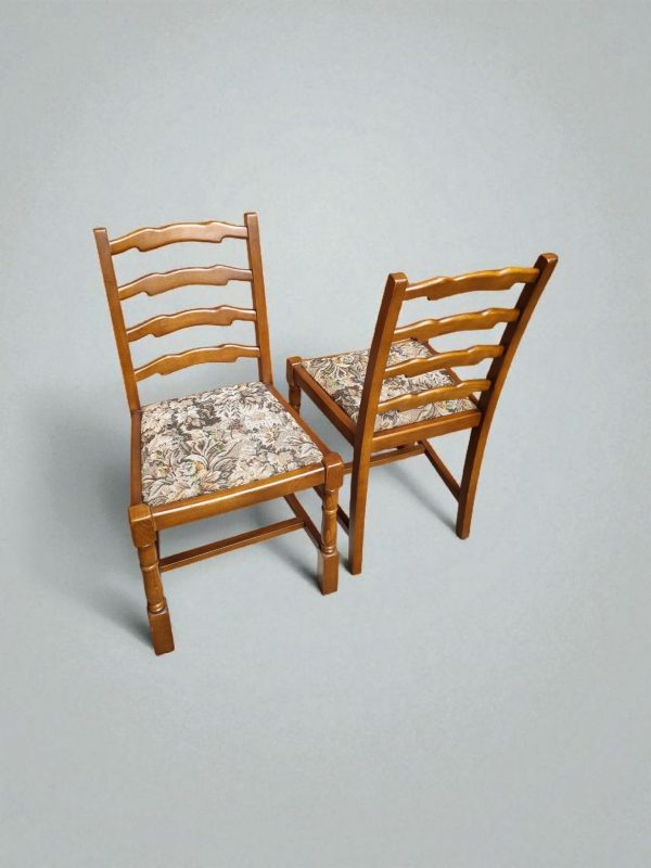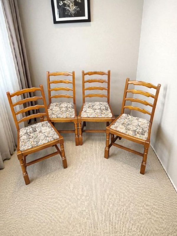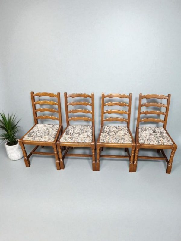 These chairs feature the brand’s distinctive ladder-back design, turned front legs, and sturdy oak frames, all finished in a warm medium oak tone.