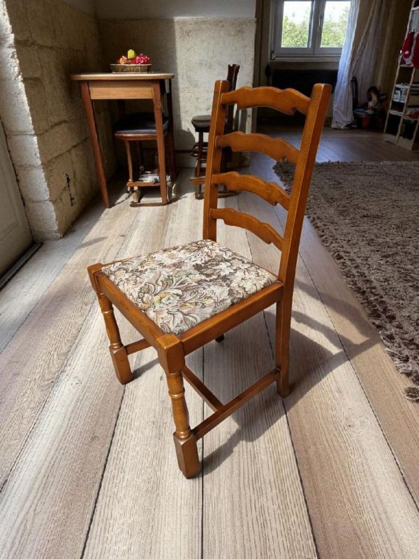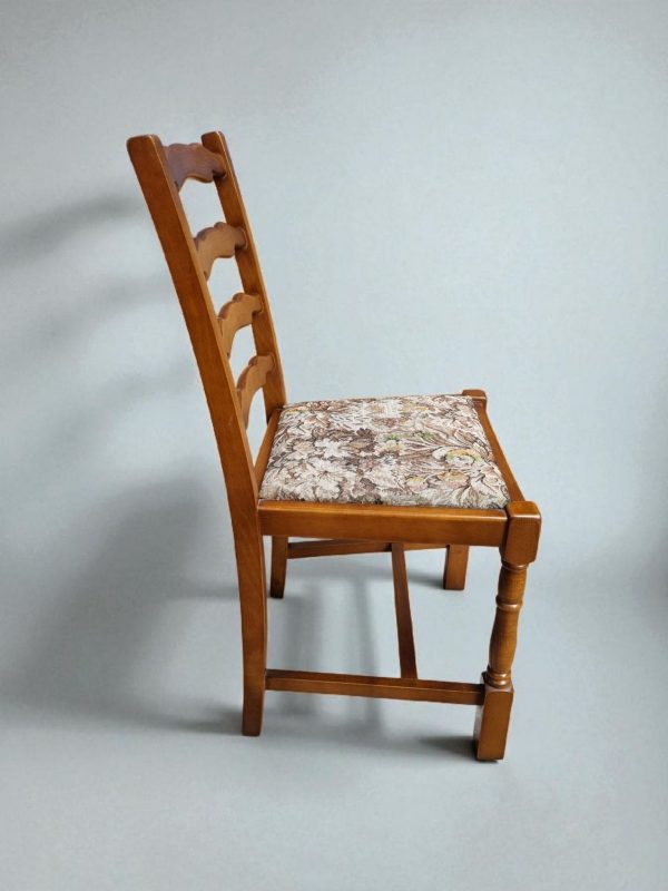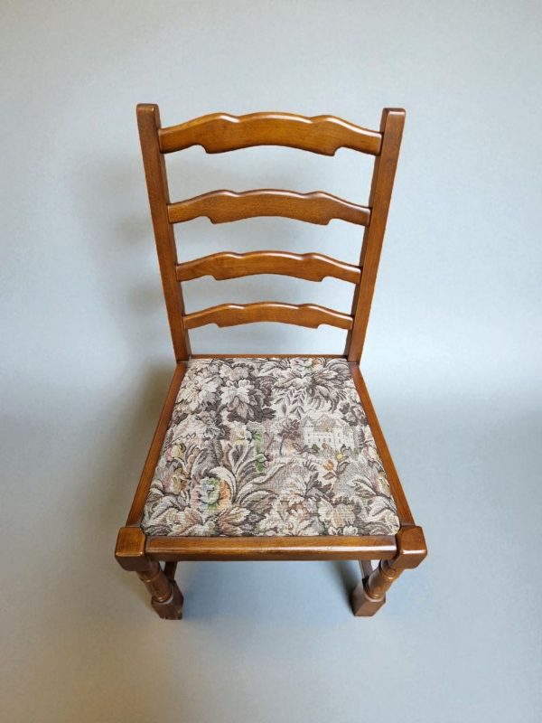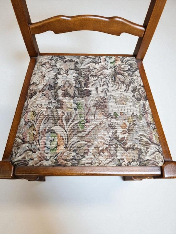 The tapestry-style upholstered seats showcase a traditional floral pattern, adding a touch of classic English charm.
