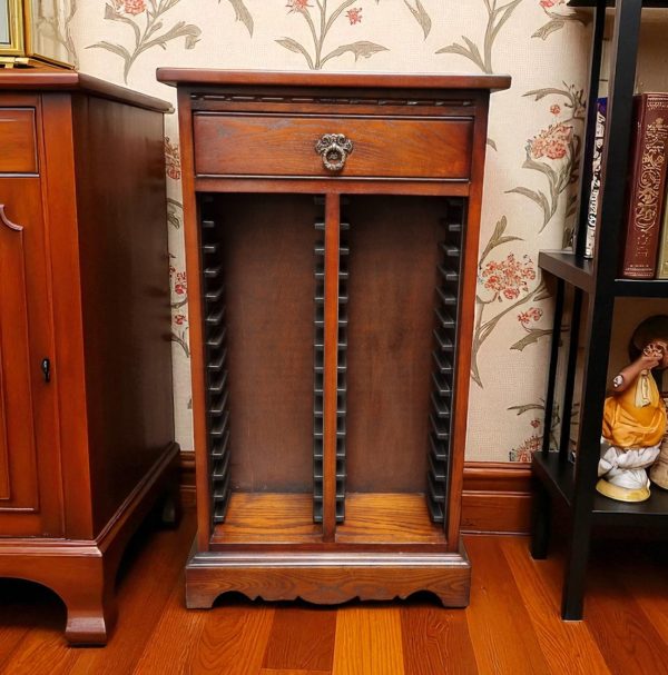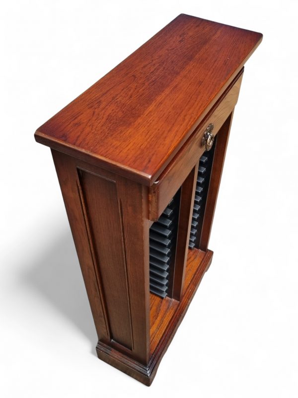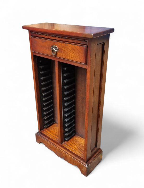 The piece features a single drawer with brass lion’s mask handle above twin open compartments fitted with storage racks, originally designed for VHS tapes but equally useful for DVDs or other small media.