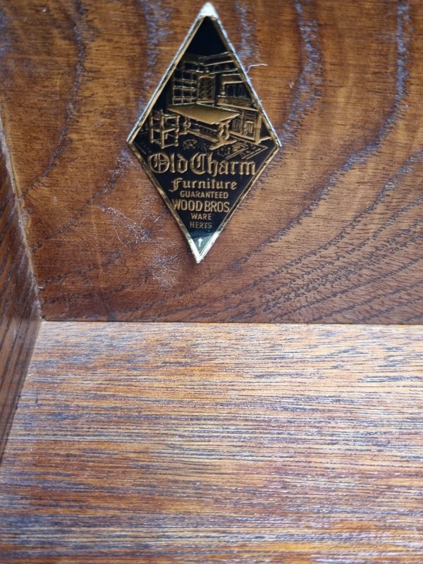 Crafted in solid oak, the cabinet displays the traditional Tudor Brown tone with attractive grain and fine detailing, a hallmark of Old Charm craftsmanship.
