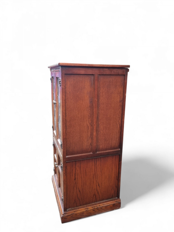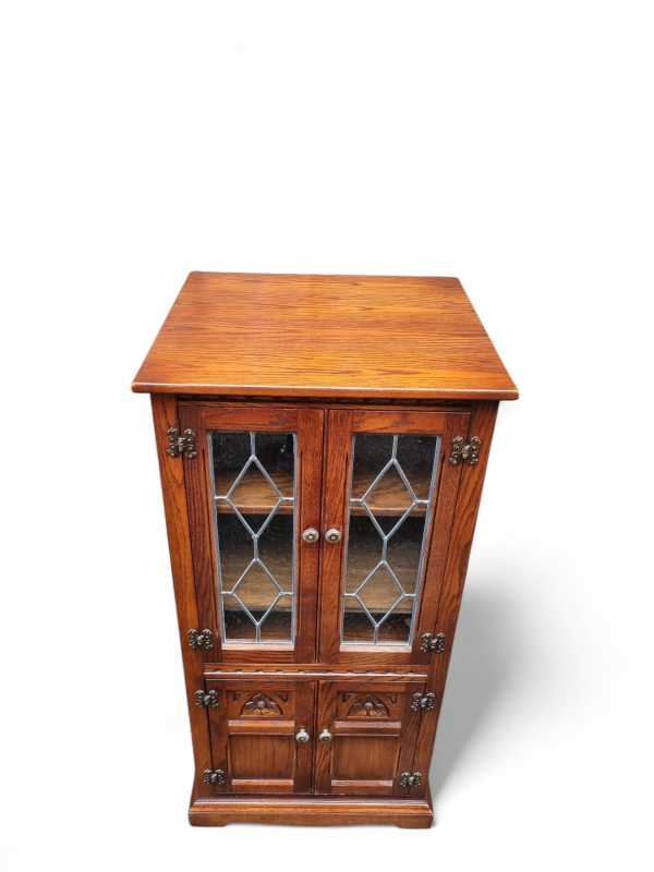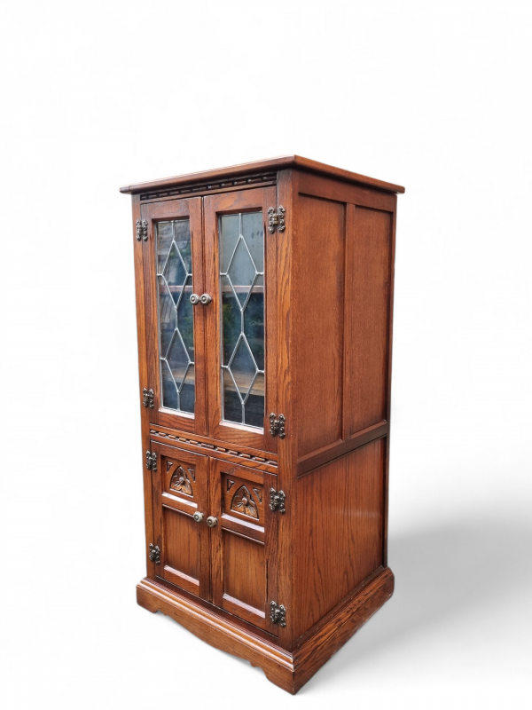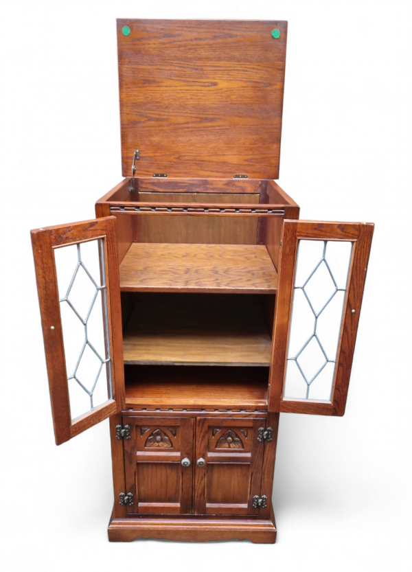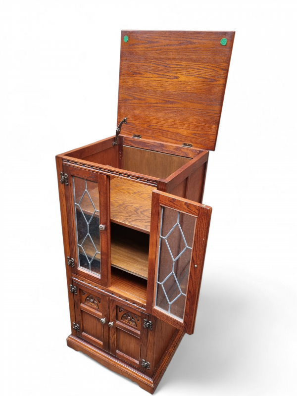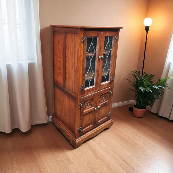 This lovely Old Charm Wood Brothers Hifi , Media , Drinks cabinet with a hinged opening lid above a pair of genuine led light doors enclosing two adjustable height shelves. Lower section with carved cactus relief to both doors which open into drawers and storage. It is finished in the classic Old Charm Tudor Brown Traditional Colour. Raised on a shaped plinth base. Add a touch of English charm to your home or office today. It provides a wonderful display space and because it fits into any room, it doesn’t take up a lot of space. This cabinet has been cleaned, re-polished, is in excellent condition and would make a very useful & attractive addition to any home. Approximate dimensions: Height – 114cm Width – 44cm Depth – 42cm Always very popular and always sell quickly a good piece that displays seriously good. Elegant lines and of good proportion It is in excellent condition and would be a very useful & attractive addition to any home.