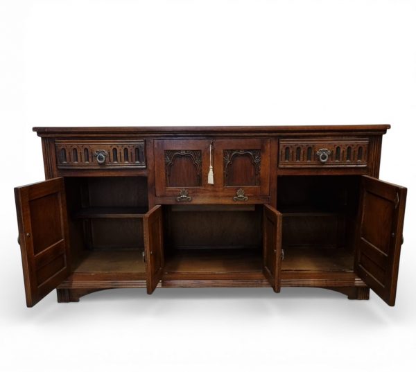 Constructed in solid oak and finished in the rich Tudor Brown tone, this piece showcases the classic Old Charm Gothic inspired detailing  carved linenfold style panels, arched door fronts, decorative hinges and original brass drop handles.