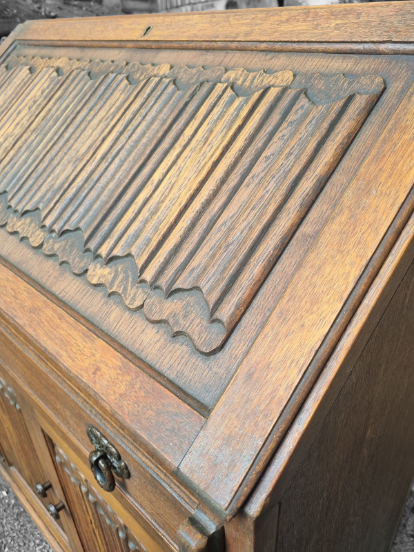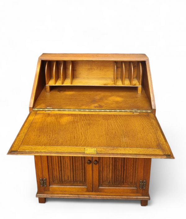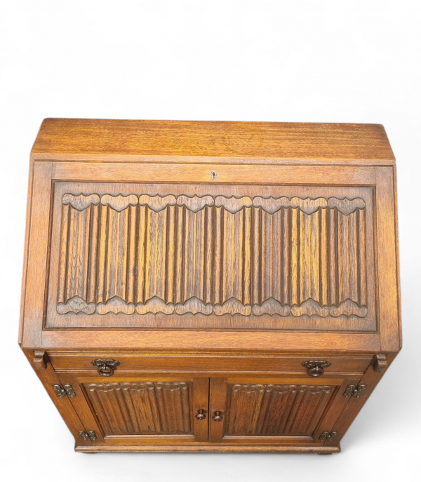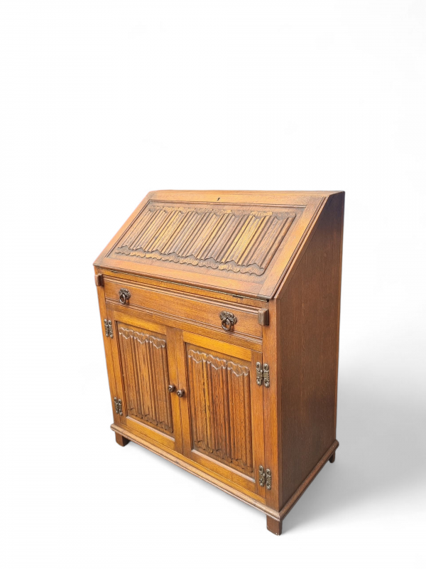 Vintage Old Charm Wood Bros / Linenfold Front Oak Bureau / Light Oak / Carved Oak / Made in England c1960 / FREE DELIVERY