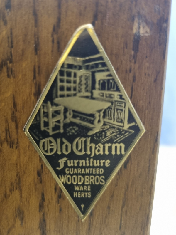 The sideboard was manufactured by Old Charm and has their labels attached.