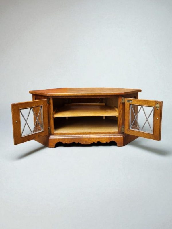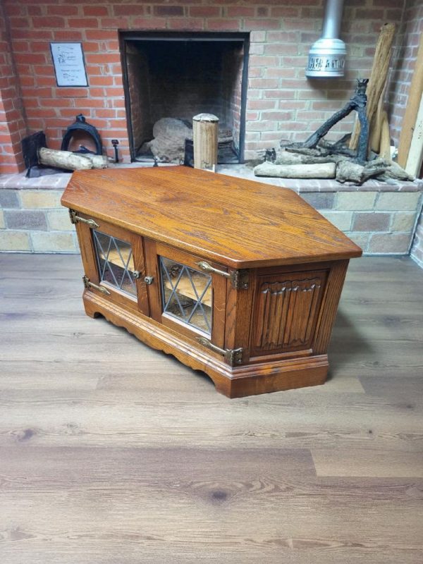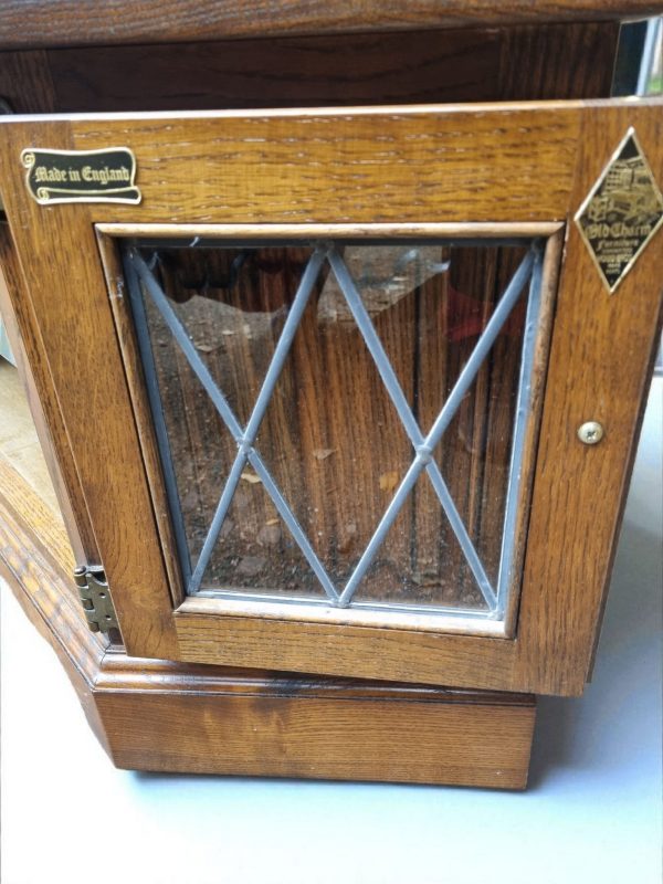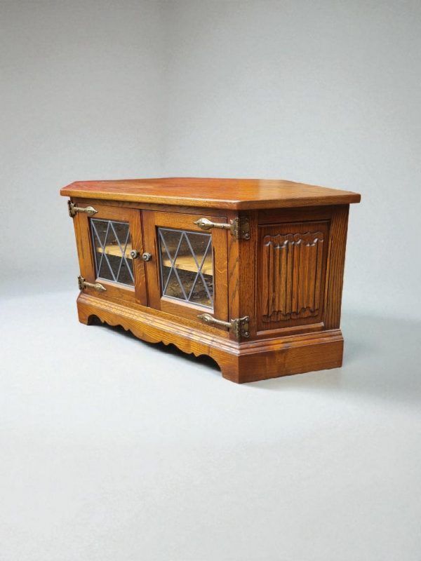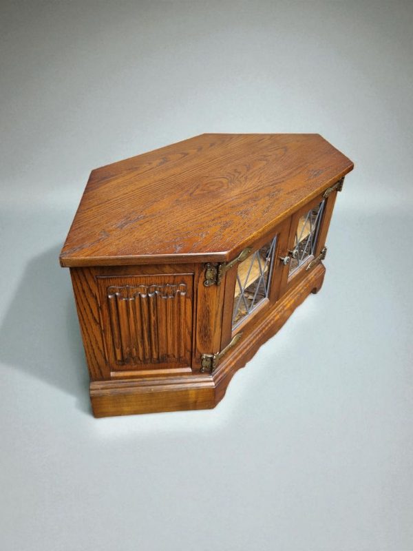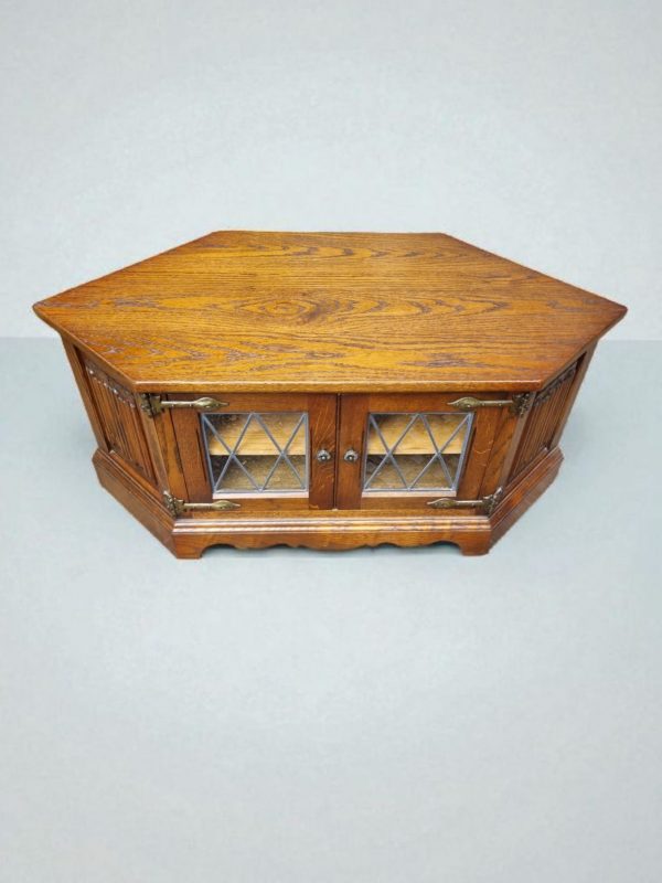 Beautiful vintage solid oak corner TV cabinet with leaded glass doors and brass hardware.