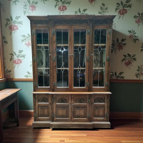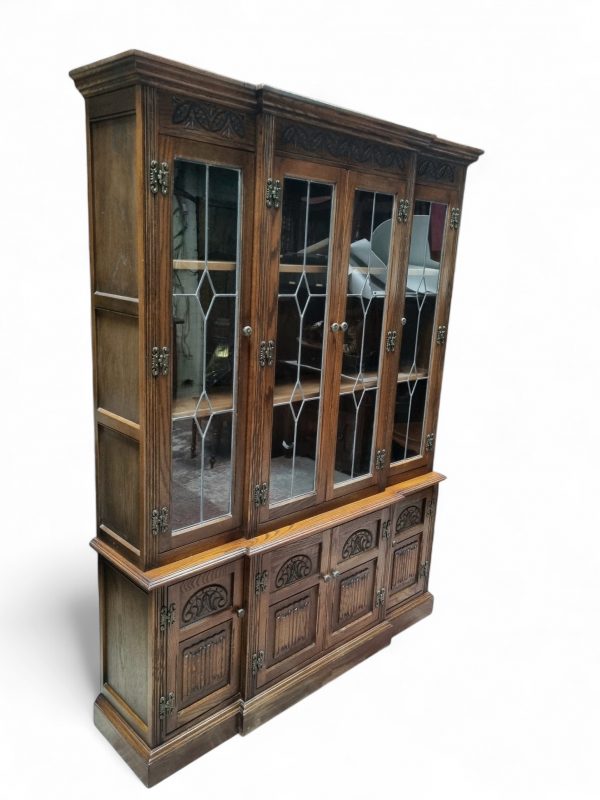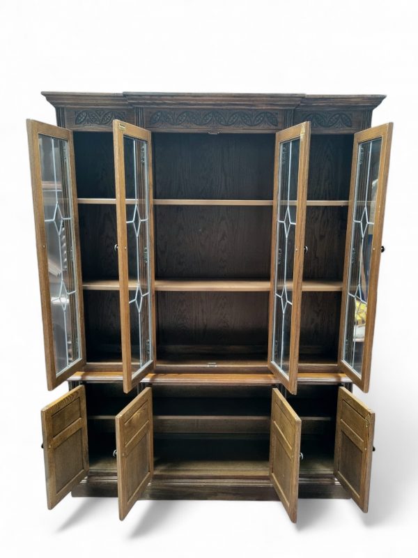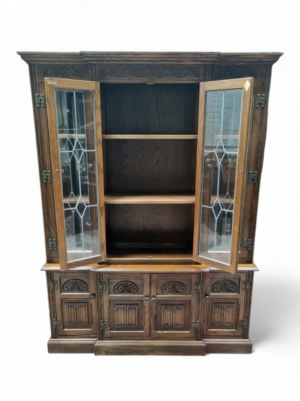 An impressive Old Charm display cabinet, crafted in England in the 1970s from solid oak in a light oak finish.