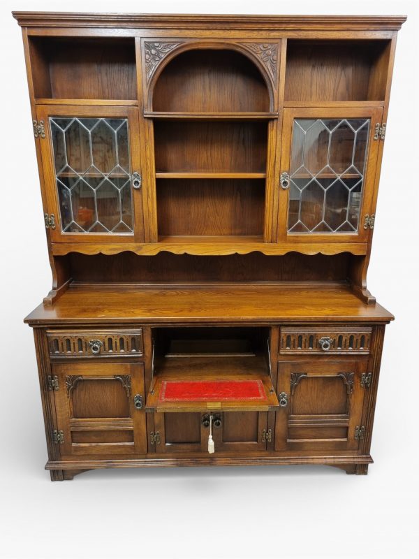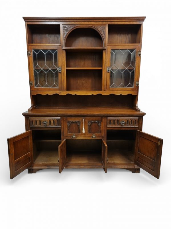 The upper section features leaded glass display cabinets with geometric glazing, open shelving and a beautifully carved central arch detail.